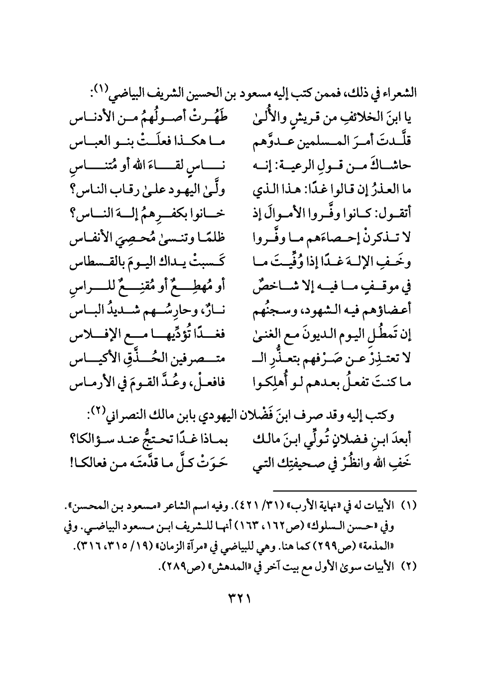 (¬١) الأبيات له في "نهاية الأرب" (٣١/ ٤٢١). وفيه اسم الشاعر "مسعود بن المحسن". وفي "حسن السلوك" (ص ١٦٢، ١٦٣) أنها للشريف ابن مسعود البياضي. وفي "المذمة" (ص ٢٩٩) كما هنا. وهي للبياضي في "مرآة الزمان" (١٩/ ٣١٥، ٣١٦).
