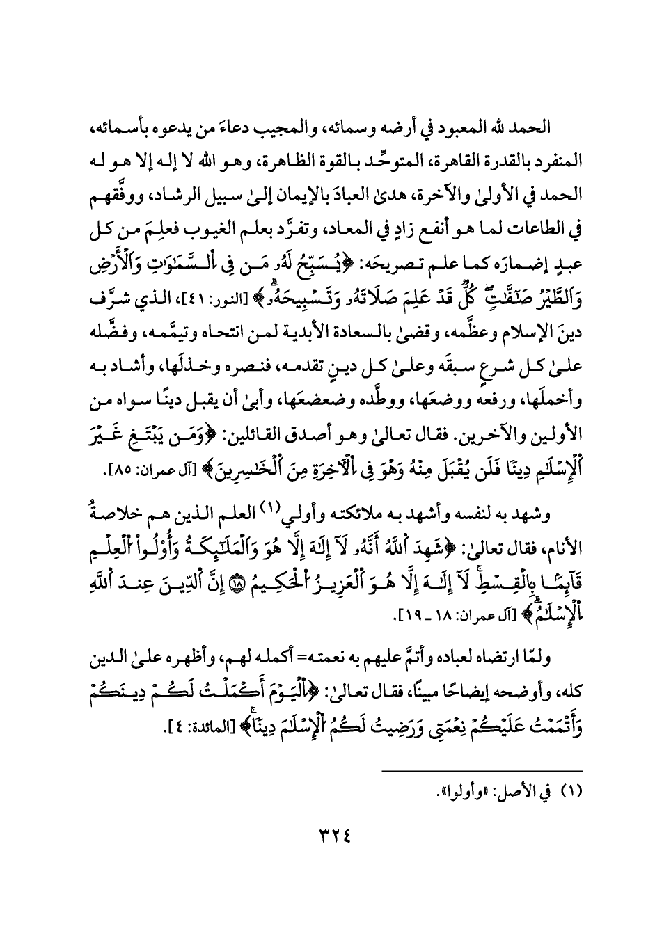الحمد لله المعبود في أرضه وسمائه، والمجيب دعاءَ من يدعوه بأسمائه، المنفرد بالقدرة القاهرة، المتوحِّد بالقوة الظاهرة، وهو الله لا إله إلا هو له الحمد في الأولى والآخرة، هدى العبادَ بالإيمان إلى سبيل الرشاد، ووفَّقهم في الطاعات لما هو أنفع زادٍ في المعاد، وتفرَّد بعلم الغيوب فعلِمَ من كل عبدٍ إضمارَه كما علم تصريحَه: {يُسَبِّحُ لَهُ مَنْ فِي السَّمَاوَاتِ وَالْأَرْضِ وَالطَّيْرُ صَافَّاتٍ كُلٌّ قَدْ عَلِمَ صَلَاتَهُ وَتَسْبِيحَهُ} [النور: ٤١]، الذي شرَّف دينَ الإسلام وعظَّمه، وقضى بالسعادة الأبدية لمن انتحاه وتيمَّمه، وفضَّله على كل شرعٍ سبقَه وعلى كل دينٍ تقدمه، فنصره وخذلَها، وأشاد به وأخملَها، ورفعه ووضعَها، ووطَّده وضعضعَها، وأبى أن يقبل دينًا سواه من الأولين والآخرين. فقال تعالى وهو أصدق القائلين: {وَمَنْ يَبْتَغِ غَيْرَ الْإِسْلَامِ دِينًا فَلَنْ يُقْبَلَ مِنْهُ وَهُوَ فِي الْآخِرَةِ مِنَ الْخَاسِرِينَ} [آل عمران: ٨٥].