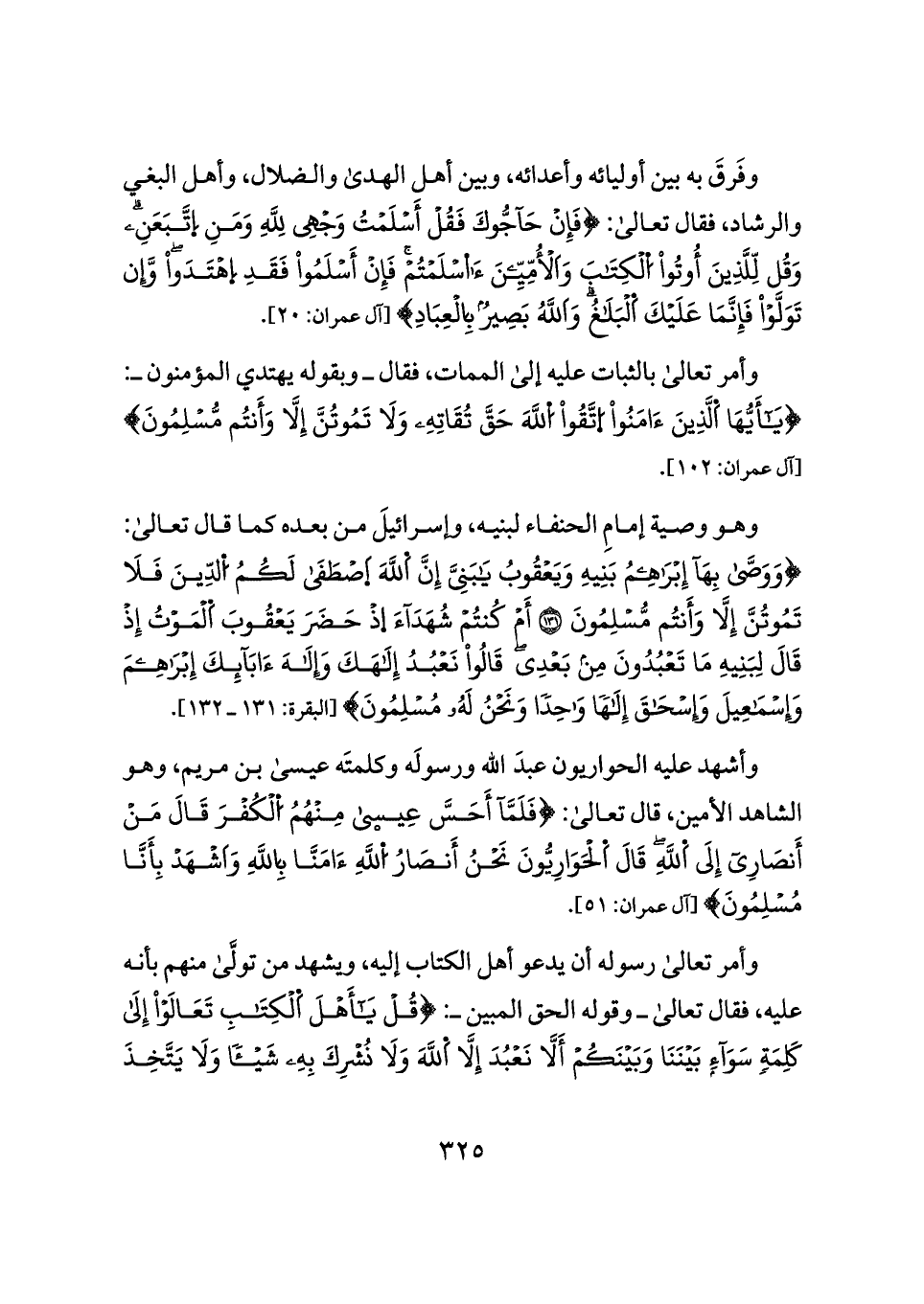 وفَرقَ به بين أوليائه وأعدائه، وبين أهل الهدى والضلال، وأهل البغي والرشاد، فقال تعالى: {فَإِنْ حَاجُّوكَ فَقُلْ أَسْلَمْتُ وَجْهِيَ لِلَّهِ وَمَنِ اتَّبَعَنِ وَقُلْ لِلَّذِينَ أُوتُوا الْكِتَابَ وَالْأُمِّيِّينَ أَأَسْلَمْتُمْ فَإِنْ أَسْلَمُوا فَقَدِ اهْتَدَوْا وَإِنْ تَوَلَّوْا فَإِنَّمَا عَلَيْكَ الْبَلَاغُ وَاللَّهُ بَصِيرٌ بِالْعِبَادِ} [آل عمران: ٢٠].