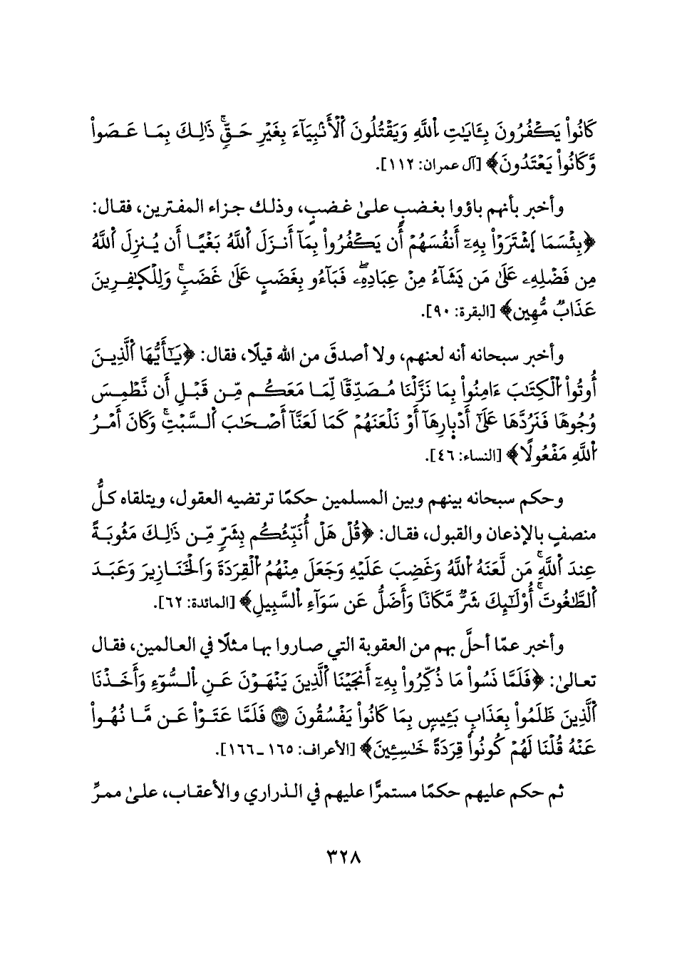 وحكم سبحانه بينهم وبين المسلمين حكمًا ترتضيه العقول، ويتلقاه كلُّ منصفٍ بالإذعان والقبول، فقال: {قُلْ هَلْ أُنَبِّئُكُمْ بِشَرٍّ مِنْ ذَلِكَ مَثُوبَةً عِنْدَ اللَّهِ مَنْ لَعَنَهُ اللَّهُ وَغَضِبَ عَلَيْهِ وَجَعَلَ مِنْهُمُ الْقِرَدَةَ وَالْخَنَازِيرَ وَعَبَدَ الطَّاغُوتَ أُولَئِكَ شَرٌّ مَكَانًا وَأَضَلُّ عَنْ سَوَاءِ السَّبِيلِ} [المائدة: ٦٢].