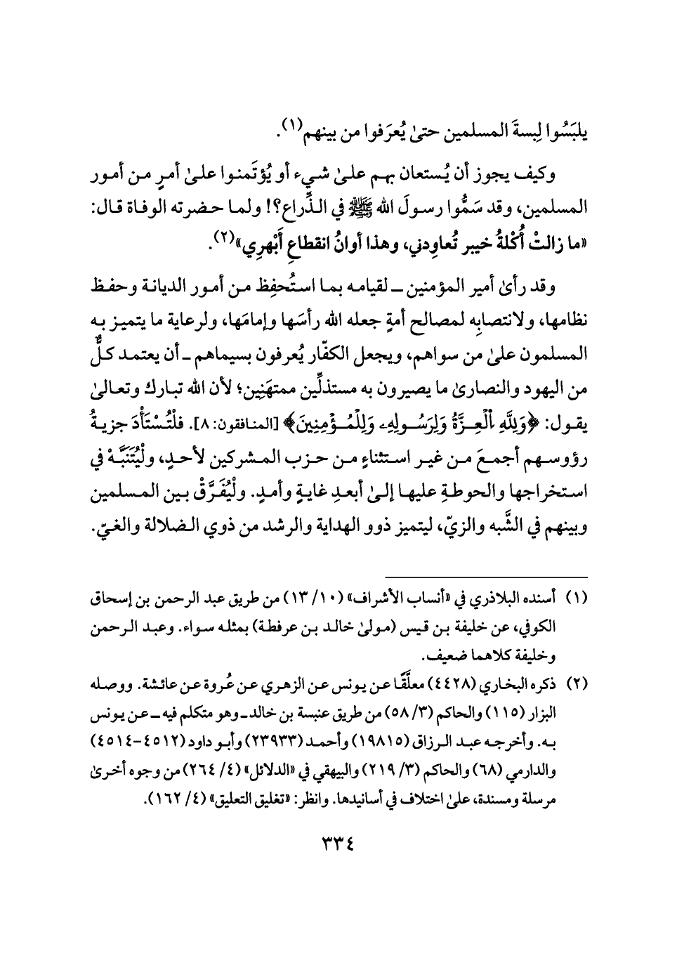 وقد رأى أمير المؤمنين ــ لقيامه بما استُحفِظ من أمور الديانة وحفظ نظامها، ولانتصابِه لمصالح أمةٍ جعله الله رأسَها وإمامَها، ولرعاية ما يتميز به المسلمون على من سواهم، ويجعل الكفّار يُعرفون بسيماهم ــ أن يعتمد كلٌّ من اليهود والنصارى ما يصيرون به مستذلِّين ممتهَنِين؛ لأن الله تبارك وتعالى يقول: {وَلِلَّهِ اِلْعِزَّةُ وَلِرَسُولِهِ وَلِلْمُؤْمِنِينَ} [المنافقون: ٨]. فلْتُسْتَأْدَ جزيةُ رؤوسهم أجمعَ من غير استثناءٍ من حزب المشركين لأحدٍ، ولْيُتَنَبَّهْ في استخراجها والحوطةِ عليها إلى أبعدِ غايةٍ وأمدٍ. ولْيُفَرَّقْ بين المسلمين وبينهم في الشَّبه والزيّ، ليتميز ذوو الهداية والرشد من ذوي الضلالة والغيّ.