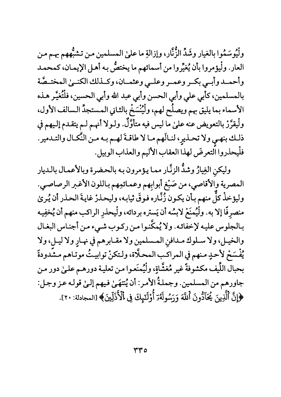 ولْيُوسَمُوا بالغيار وشَدِّ الزُّنَّار، وإزالةِ ما على المسلمين من تشبُّههم بهم من العار. ولْيؤمروا بأن يُغيِّروا من أسمائهم ما يختصُّ به أهل الإيمان، كمحمد وأحمد وأبي بكر وعمر وعلي وعثمان، وكذلك الكنى المختصَّة بالمسلمين، كأبي علي وأبي الحسن وأبي عبد الله وأبي الحسين، فلْتُغيَّر هذه الأسماء بما يليق بهم ويصلُح لهم، ولْيُنْسَخْ بالثاني المستجدِّ السالف الأول، ولْيقرَّرْ بالتعويض عنه على ما ليس فيه متأوَّلٌ. ولولا أنهم لم يتقدم إليهم في ذلك بنهيٍ ولا تحذيرٍ، لنالَهم ما لا طاقةَ لهم به من النَّكال والتدمير. فلْيحذروا التعرضَ لهذا العقاب الأليم والعذاب الوبيل.