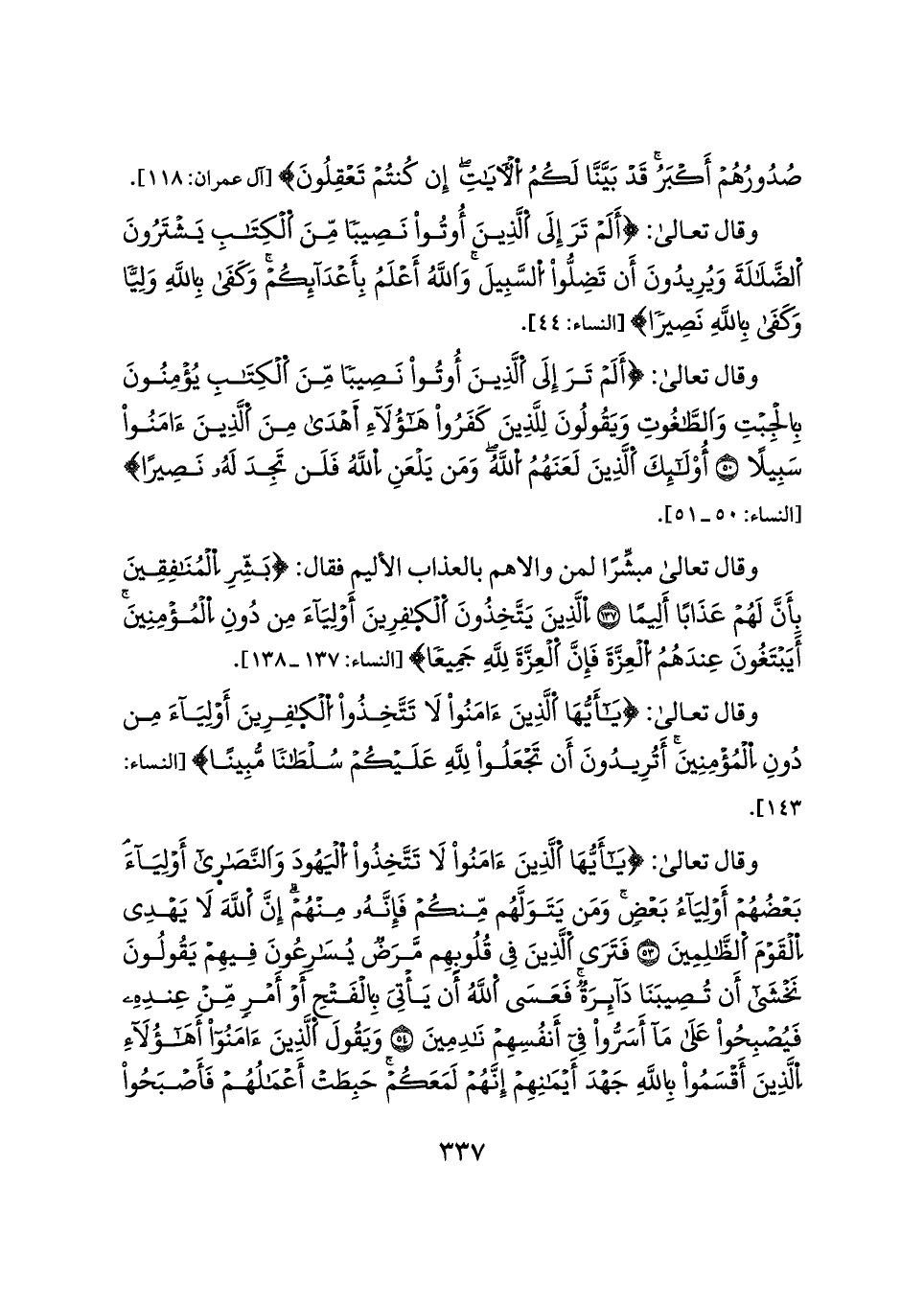 وقال تعالى: {يَاأَيُّهَا الَّذِينَ آمَنُوا لَا تَتَّخِذُوا الْكَافِرِينَ أَوْلِيَاءَ مِنْ دُونِ الْمُؤْمِنِينَ أَتُرِيدُونَ أَنْ تَجْعَلُوا لِلَّهِ عَلَيْكُمْ سُلْطَانًا مُبِينًا} [النساء: ١٤٣].