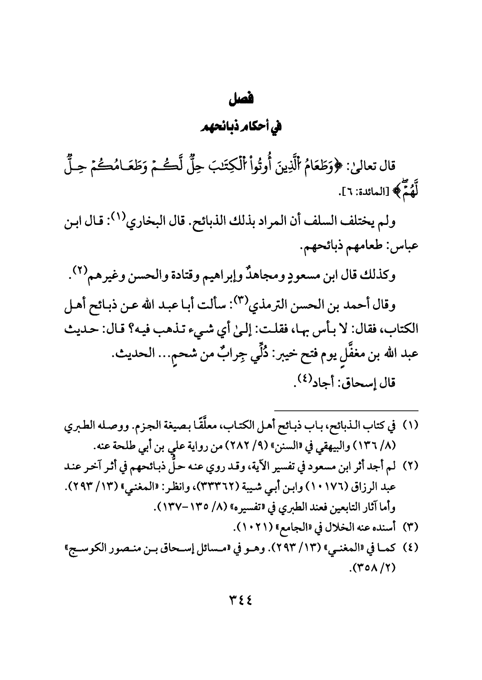 (¬٢) لم أجد أثر ابن مسعود في تفسير الآية، وقد روي عنه حلُّ ذبائحهم في أثر آخر عند عبد الرزاق (١٠١٧٦) وابن أبي شيبة (٣٣٣٦٢)، وانظر: "المغني" (١٣/ ٢٩٣). وأما آثار التابعين فعند الطبري في "تفسيره" (٨/ ١٣٥ - ١٣٧).
