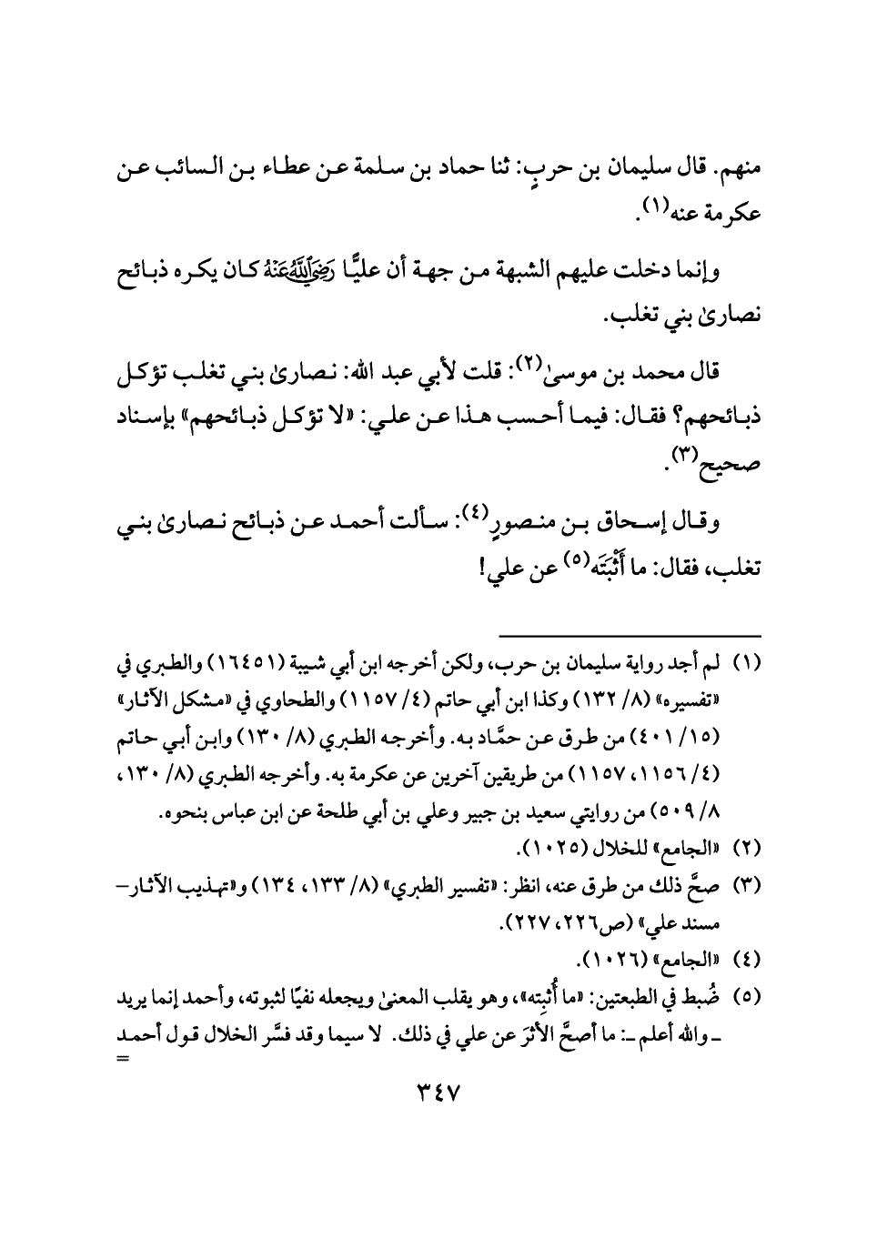 قال محمد بن موسى (¬٢): قلت لأبي عبد الله: نصارى بني تغلب تؤكل ذبائحهم؟ فقال: فيما أحسب هذا عن علي: "لا تؤكل ذبائحهم" بإسناد صحيح (¬٣).