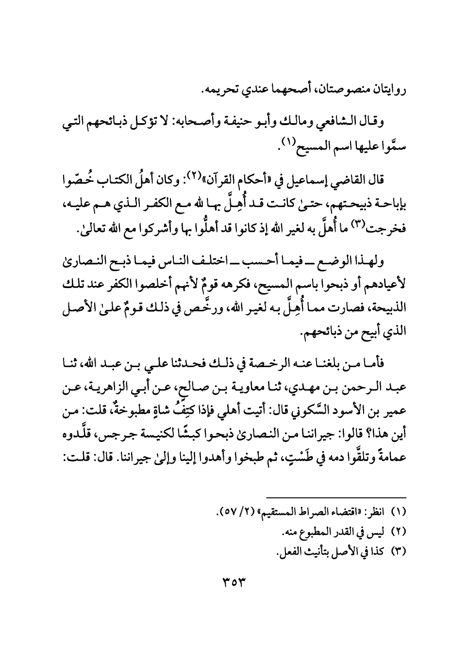 ولهذا الوضع ــ فيما أحسب ــ اختلف الناس فيما ذبح النصارى لأعيادهم أو ذبحوا باسم المسيح، فكرهه قومٌ لأنهم أخلصوا الكفر عند تلك الذبيحة، فصارت مما أُهِلَّ به لغير الله، ورخَّص في ذلك قومٌ على الأصل الذي أبيح من ذبائحهم.
