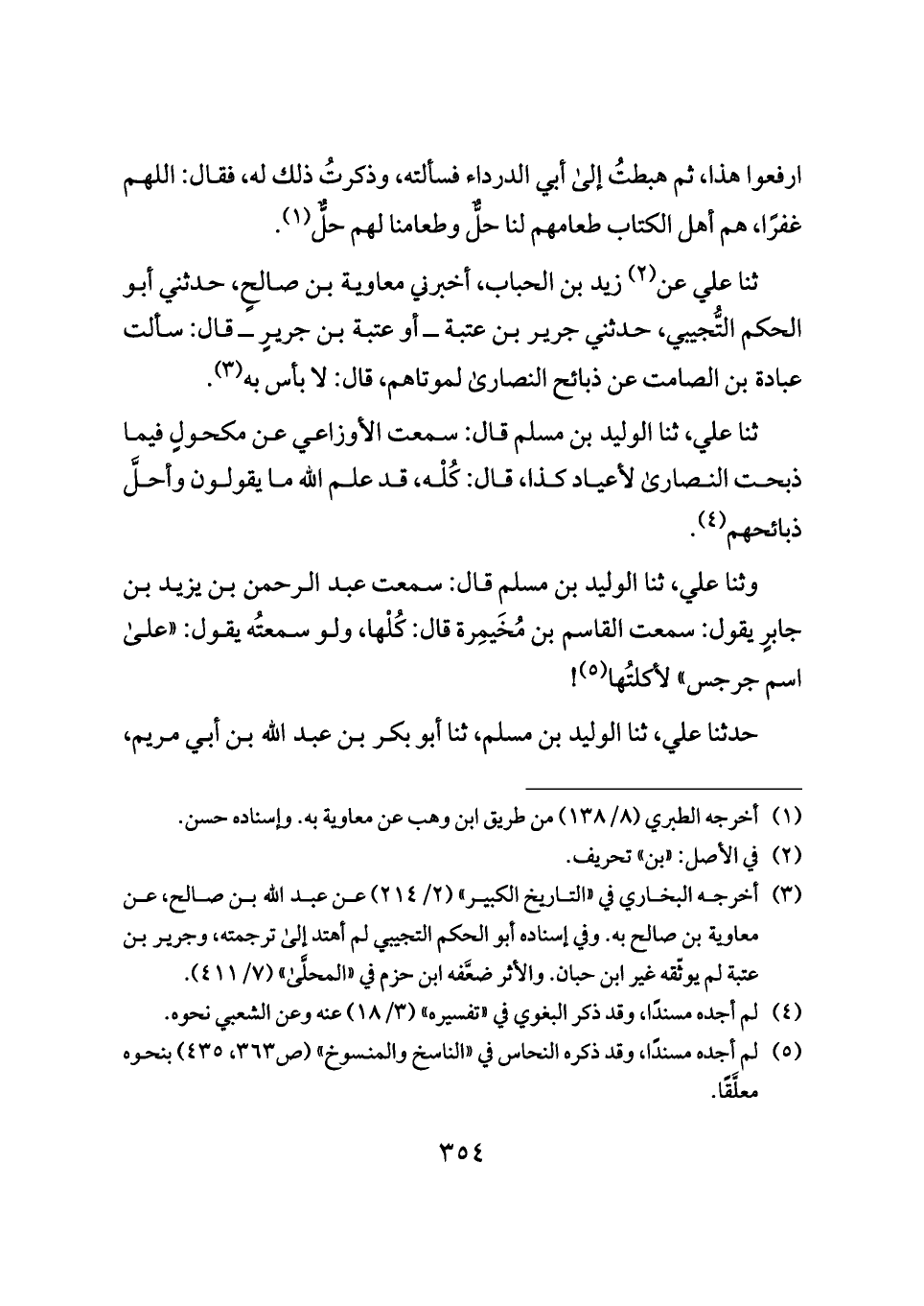 وثنا علي، ثنا الوليد بن مسلم قال: سمعت عبد الرحمن بن يزيد بن جابرٍ يقول: سمعت القاسم بن مُخَيمِرة قال: كُلْها، ولو سمعتُه يقول: "على اسم جرجس" لأكلتُها (¬٥)!
