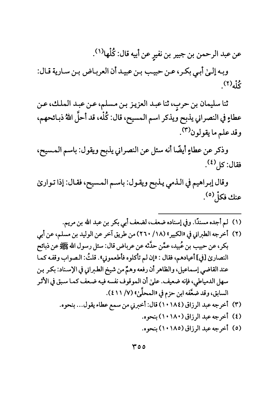 ثنا سليمان بن حربٍ، ثنا عبد العزيز بن مسلم، عن عبد الملك، عن عطاءٍ في النصراني يذبح ويذكر اسم المسيح، قال: كُلْه، قد أحلَّ اللهُ ذبائحهم، وقد علم ما يقولون (¬٣).