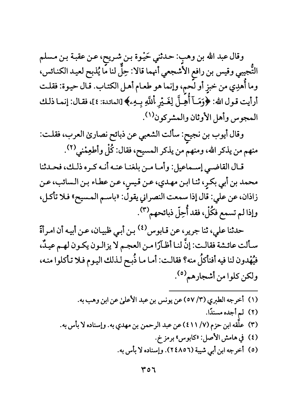 وقال أيوب بن نجيحٍ: سألت الشعبي عن ذبائح نصارى العرب، فقلت: منهم من يذكر الله، ومنهم من يذكر المسيح، فقال: كُلْ وأطعِمْني (¬٢).