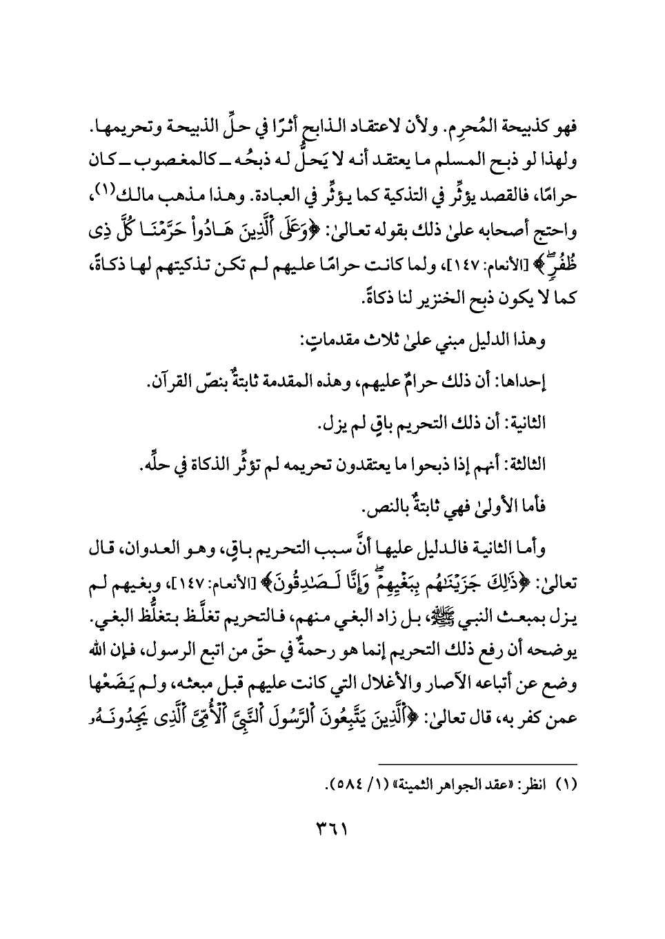 فهو كذبيحة المُحرِم. ولأن لاعتقاد الذابح أثرًا في حلِّ الذبيحة وتحريمها. ولهذا لو ذبح المسلم ما يعتقد أنه لا يَحلُّ له ذبحُه ــ كالمغصوب ــ كان حرامًا، فالقصد يؤثِّر في التذكية كما يؤثِّر في العبادة. وهذا مذهب مالك (¬١)، واحتج أصحابه على ذلك بقوله تعالى: {وَعَلَى اَلَّذِينَ هَادُوا حَرَّمْنَا كُلَّ ذِي ظُفُرٍ} [الأنعام: ١٤٧]، ولما كانت حرامًا عليهم لم تكن تذكيتهم لها ذكاةً، كما لا يكون ذبح الخنزير لنا ذكاةً.