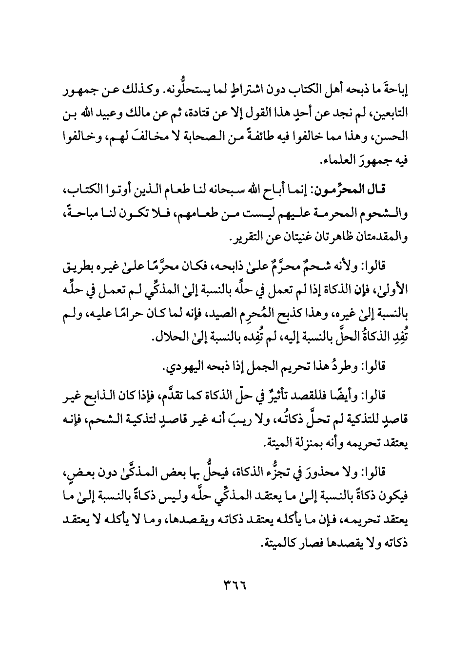إباحةَ ما ذبحه أهل الكتاب دون اشتراطٍ لما يستحلُّونه. وكذلك عن جمهور التابعين، لم نجد عن أحدٍ هذا القول إلا عن قتادة، ثم عن مالك وعبيد الله بن الحسن، وهذا مما خالفوا فيه طائفةً من الصحابة لا مخالفَ لهم، وخالفوا فيه جمهورَ العلماء.