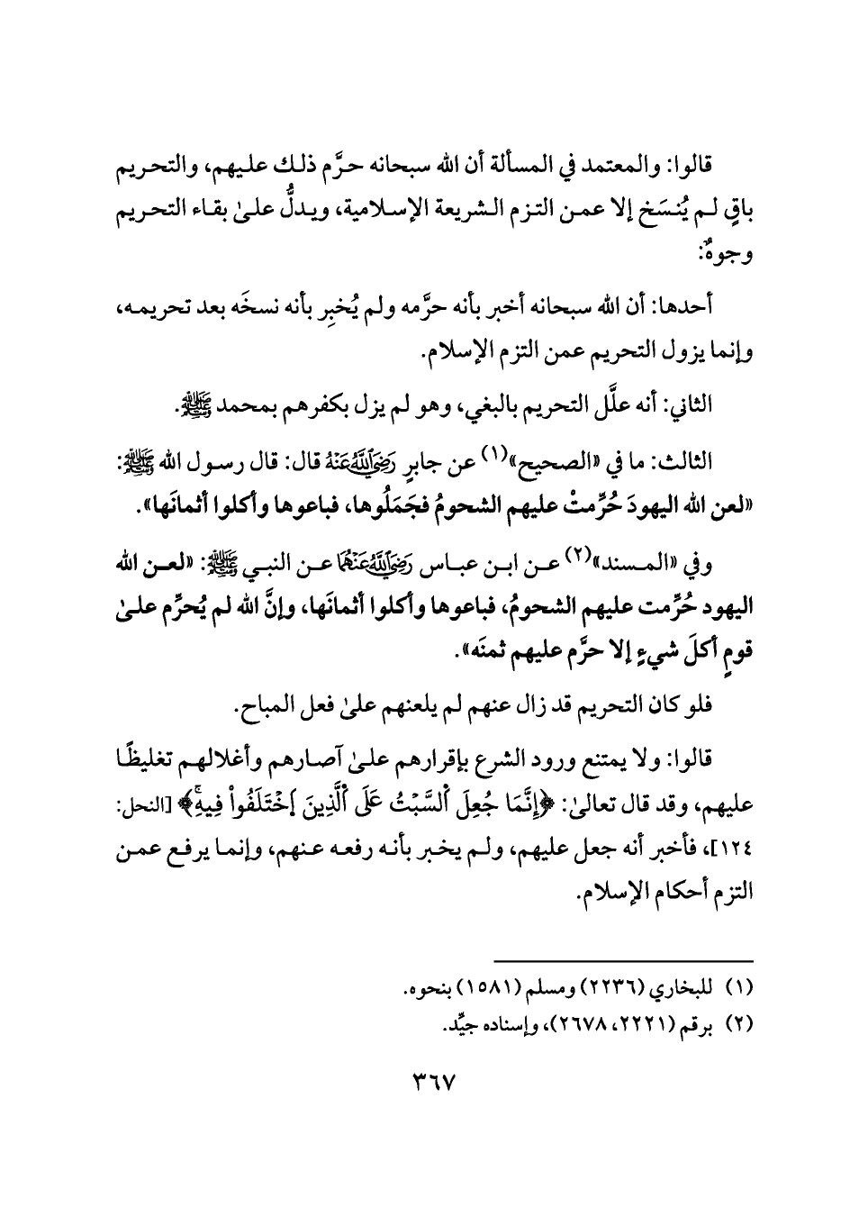 قالوا: والمعتمد في المسألة أن الله سبحانه حرَّم ذلك عليهم، والتحريم باقٍ لم يُنسَخ إلا عمن التزم الشريعة الإسلامية، ويدلُّ على بقاء التحريم وجوهٌ: