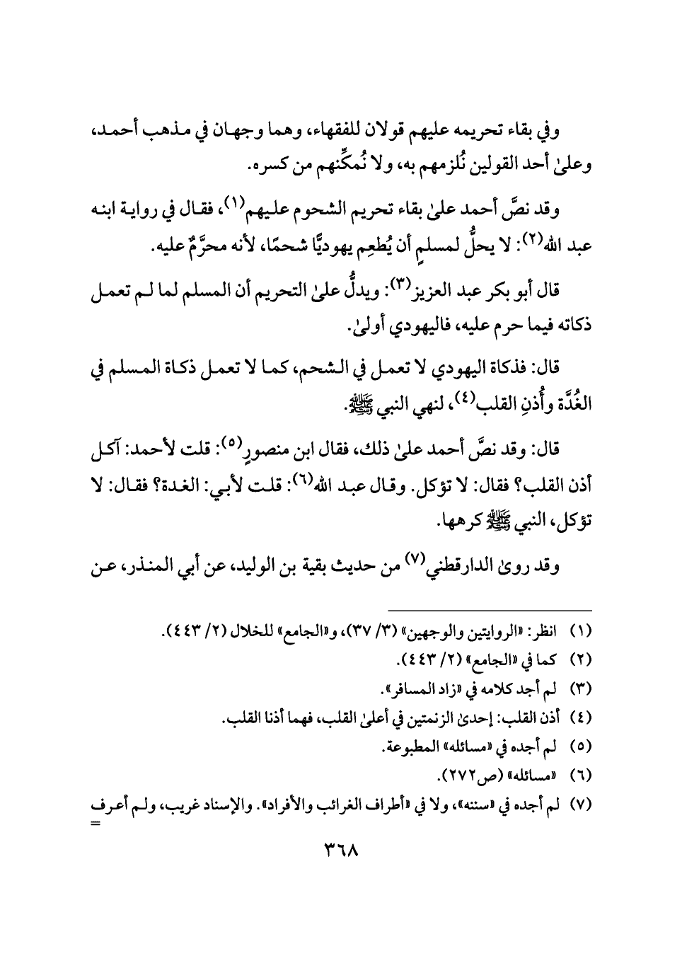 وقد نصَّ أحمد على بقاء تحريم الشحوم عليهم (¬١)، فقال في رواية ابنه عبد الله (¬٢): لا يحلُّ لمسلمٍ أن يُطعِم يهوديًّا شحمًا، لأنه محرَّمٌ عليه.