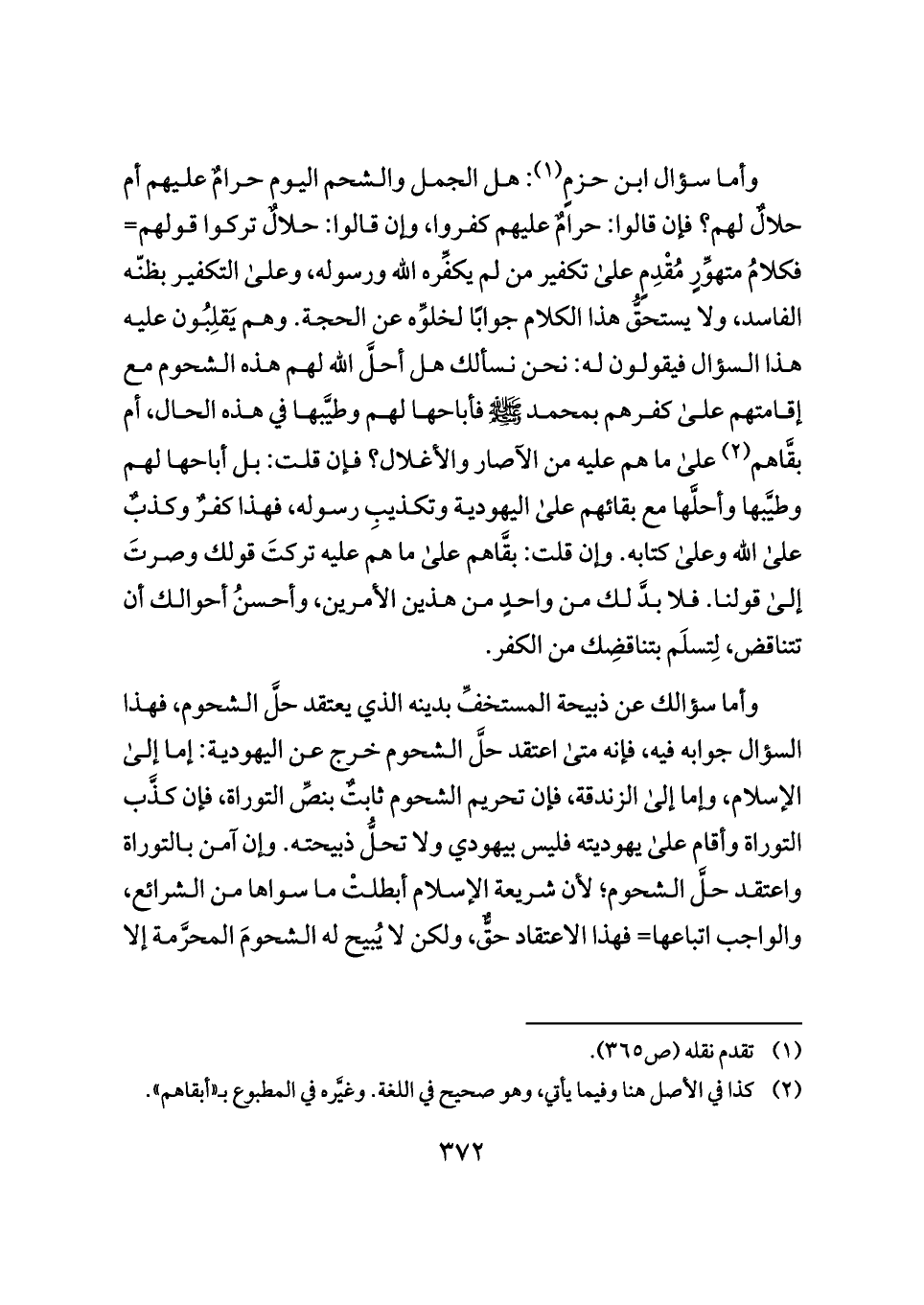 وأما سؤالك عن ذبيحة المستخفِّ بدينه الذي يعتقد حلَّ الشحوم، فهذا السؤال جوابه فيه، فإنه متى اعتقد حلَّ الشحوم خرج عن اليهودية: إما إلى الإسلام، وإما إلى الزندقة، فإن تحريم الشحوم ثابتٌ بنصِّ التوراة، فإن كذَّب التوراة وأقام على يهوديته فليس بيهودي ولا تحلُّ ذبيحته. وإن آمن بالتوراة واعتقد حلَّ الشحوم؛ لأن شريعة الإسلام أبطلتْ ما سواها من الشرائع، والواجب اتباعها= فهذا الاعتقاد حقٌّ، ولكن لا يُبيح له الشحومَ المحرَّمة إلا