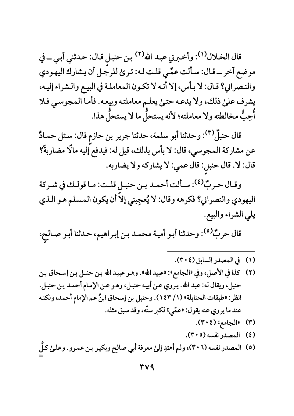 قال الخلال (¬١): وأخبرني عبد الله (¬٢) بن حنبلٍ قال: حدثني أبي ــ في موضع آخر ــ قال: سألت عمِّي قلت له: ترى للرجل أن يشارك اليهودي والنصراني؟ قال: لا بأس، إلا أنه لا تكون المعاملة في البيع والشراء إليه، يشرف على ذلك، ولا يدعه حتى يعلم معاملته وبيعه. فأما المجوسي فلا أُحِبُّ مخالطته ولا معاملته؛ لأنه يستحلُّ ما لا يستحلُّ هذا.