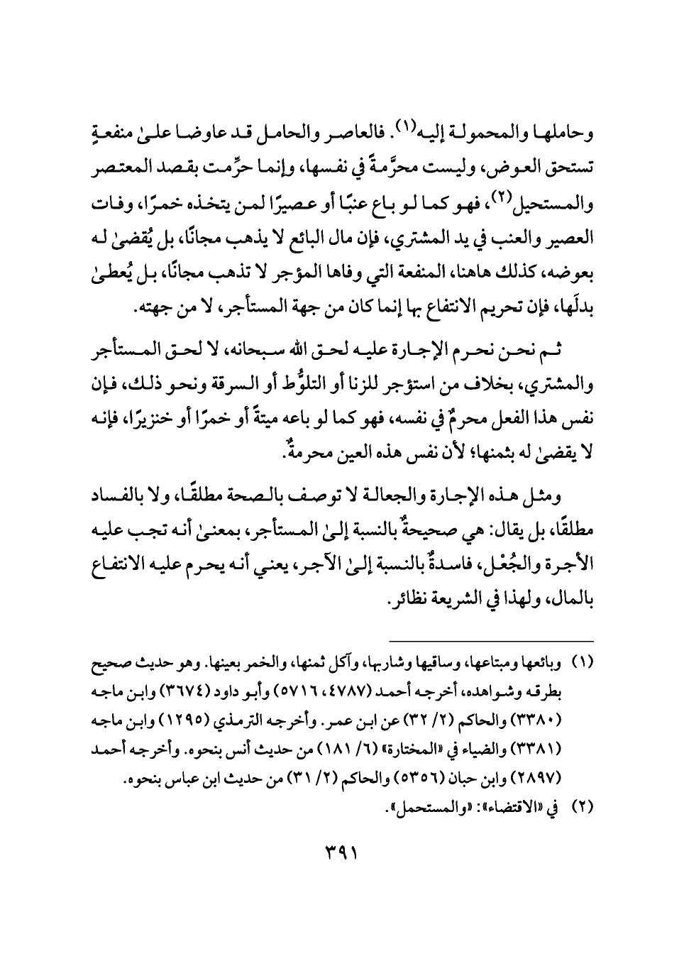 وحاملها والمحمولة إليه (¬١). فالعاصر والحامل قد عاوضا على منفعةٍ تستحق العوض، وليست محرَّمةً في نفسها، وإنما حرِّمت بقصد المعتصر والمستحيل (¬٢)، فهو كما لو باع عنبًا أو عصيرًا لمن يتخذه خمرًا، وفات العصير والعنب في يد المشتري، فإن مال البائع لا يذهب مجانًا، بل يُقضى له بعوضه، كذلك هاهنا، المنفعة التي وفاها المؤجر لا تذهب مجانًا، بل يُعطى بدلَها، فإن تحريم الانتفاع بها إنما كان من جهة المستأجر، لا من جهته.