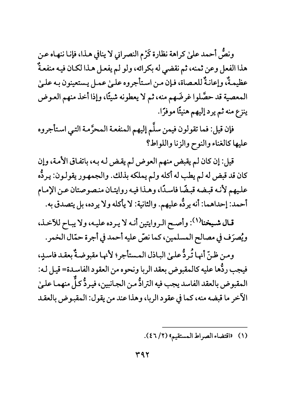 ونصُّ أحمد على كراهة نظارة كَرْم النصراني لا ينافي هذا، فإنا ننهاه عن هذا الفعل وعن ثمنه، ثم نقضي له بكرائه، ولو لم يفعل هذا لكان فيه منفعةٌ عظيمةٌ، وإعانةٌ للعصاة، فإن من استأجروه على عمل يستعينون به على المعصية قد حصَّلوا غرضَهم منه، ثم لا يعطونه شيئًا، وإذا أخذ منهم العوض ينزع منه ثم يرد إليهم هنيئًا موفرًا.