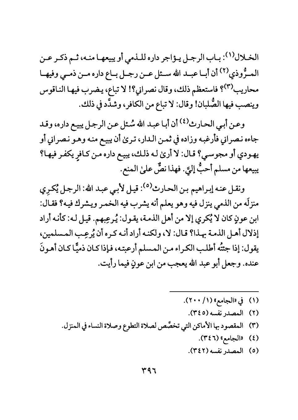 الخلال (¬١): باب الرجل يؤاجر داره للذمي أو يبيعها منه، ثم ذكر عن المرُّوذي (¬٢) أن أبا عبد الله سئل عن رجل باع داره من ذمي وفيها محاريب (¬٣)؟ فاستعظم ذلك، وقال نصراني؟! لا تباع، يضرب فيها الناقوس وينصب فيها الصُّلبان! وقال: لا تباع من الكافر، وشدَّد في ذلك.