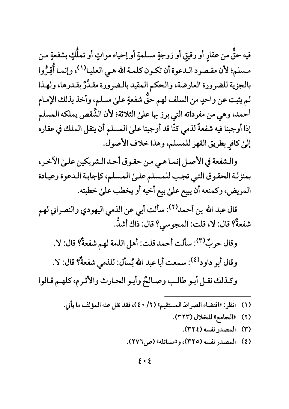فيه حقٌّ من عقارٍ أو رقيقٍ أو زوجةٍ مسلمةٍ أو إحياء مواتٍ أو تملُّكٍ بشفعةٍ من مسلم؛ لأن مقصود الدعوة أن تكون كلمة الله هي العليا (¬١)، وإنما أُقِرُّوا بالجزية للضرورة العارضة، والحكم المقيد بالضرورة مقدَّرٌ بقدرها، ولهذا لم يثبت عن واحدٍ من السلف لهم حقُّ شفعةٍ على مسلم، وأخذ بذلك الإمام أحمد، وهي من مفرداته التي برز بها على الثلاثة؛ لأن الشِّقص يملكه المسلم إذا أوجبنا فيه شفعةً لذمي كنّا قد أوجبنا على المسلم أن ينقل الملك في عقاره إلى كافرٍ بطريق القهر للمسلم، وهذا خلاف الأصول.