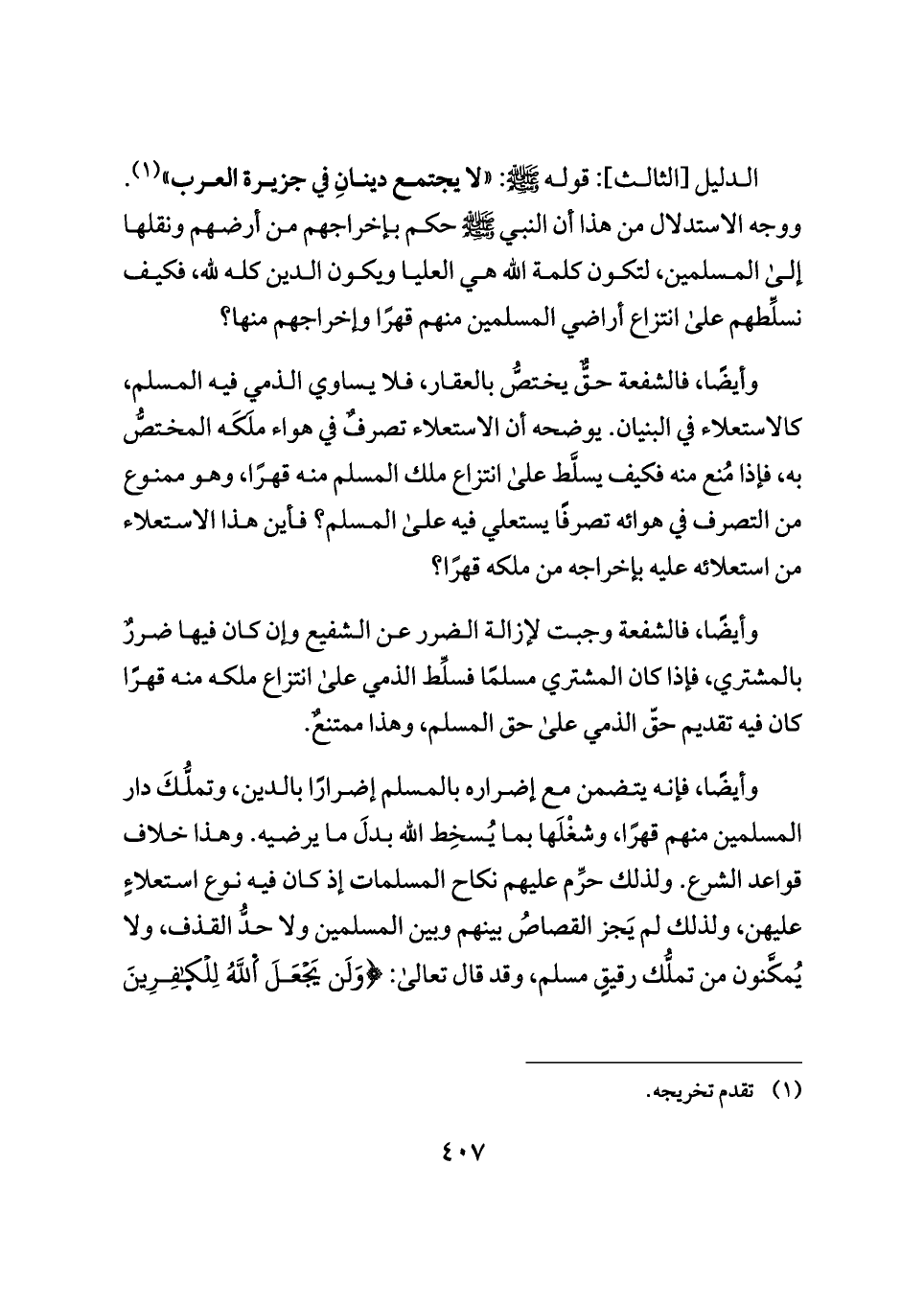 وأيضًا، فالشفعة حقٌّ يختصُّ بالعقار، فلا يساوي الذمي فيه المسلم، كالاستعلاء في البنيان. يوضحه أن الاستعلاء تصرفٌ في هواء ملَكَه المختصُّ به، فإذا مُنع منه فكيف يسلَّط على انتزاع ملك المسلم منه قهرًا، وهو ممنوع من التصرف في هوائه تصرفًا يستعلي فيه على المسلم؟ فأين هذا الاستعلاء من استعلائه عليه بإخراجه من ملكه قهرًا؟