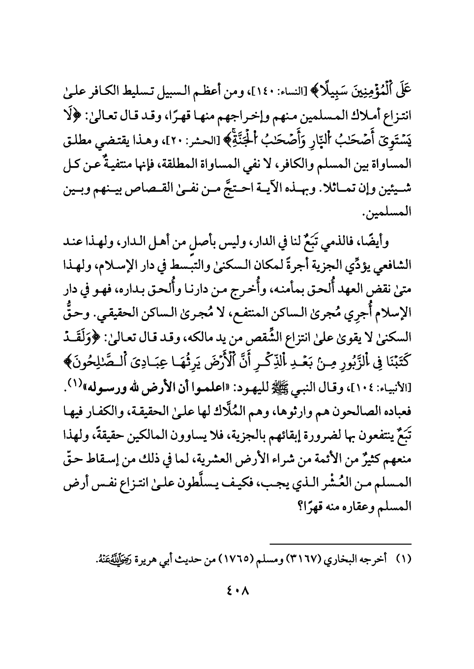 عَلَى اَلْمُؤْمِنِينَ سَبِيلًا} [النساء: ١٤٠]، ومن أعظم السبيل تسليط الكافر على انتزاع أملاك المسلمين منهم وإخراجهم منها قهرًا، وقد قال تعالى: {لَا يَسْتَوِي أَصْحَابُ النَّارِ وَأَصْحَابُ الْجَنَّةِ} [الحشر: ٢٠]، وهذا يقتضي مطلق المساواة بين المسلم والكافر، لا نفي المساواة المطلقة، فإنها منتفيةٌ عن كل شيئين وإن تماثلا. وبهذه الآية احتجَّ من نفى القصاص بينهم وبين المسلمين.
