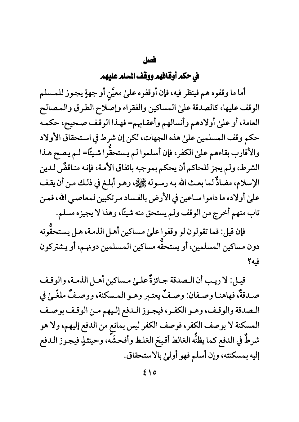 أما ما وقفوه هم فينظر فيه، فإن أوقفوه على معيَّنٍ أو جهةٍ يجوز للمسلم الوقف عليها، كالصدقة على المساكين والفقراء وإصلاح الطرق والمصالح العامة، أو على أولادهم وأنسالهم وأعقابهم= فهذا الوقف صحيح، حكمه حكم وقف المسلمين على هذه الجهات، لكن إن شرط في استحقاق الأولاد والأقارب بقاءهم على الكفر، فإن أسلموا لم يستحقُّوا شيئًا= لم يصح هذا الشرط، ولم يجز للحاكم أن يحكم بموجبه باتفاق الأمة، فإنه مناقضٌ لدين الإسلام، مضادٌّ لما بعث الله به رسوله - صلى الله عليه وسلم -، وهو أبلغ في ذلك من أن يقف على أولاده ما داموا ساعين في الأرض بالفساد مرتكبين لمعاصي الله، فمن تاب منهم أخرج من الوقف ولم يستحق منه شيئًا، وهذا لا يجيزه مسلم.