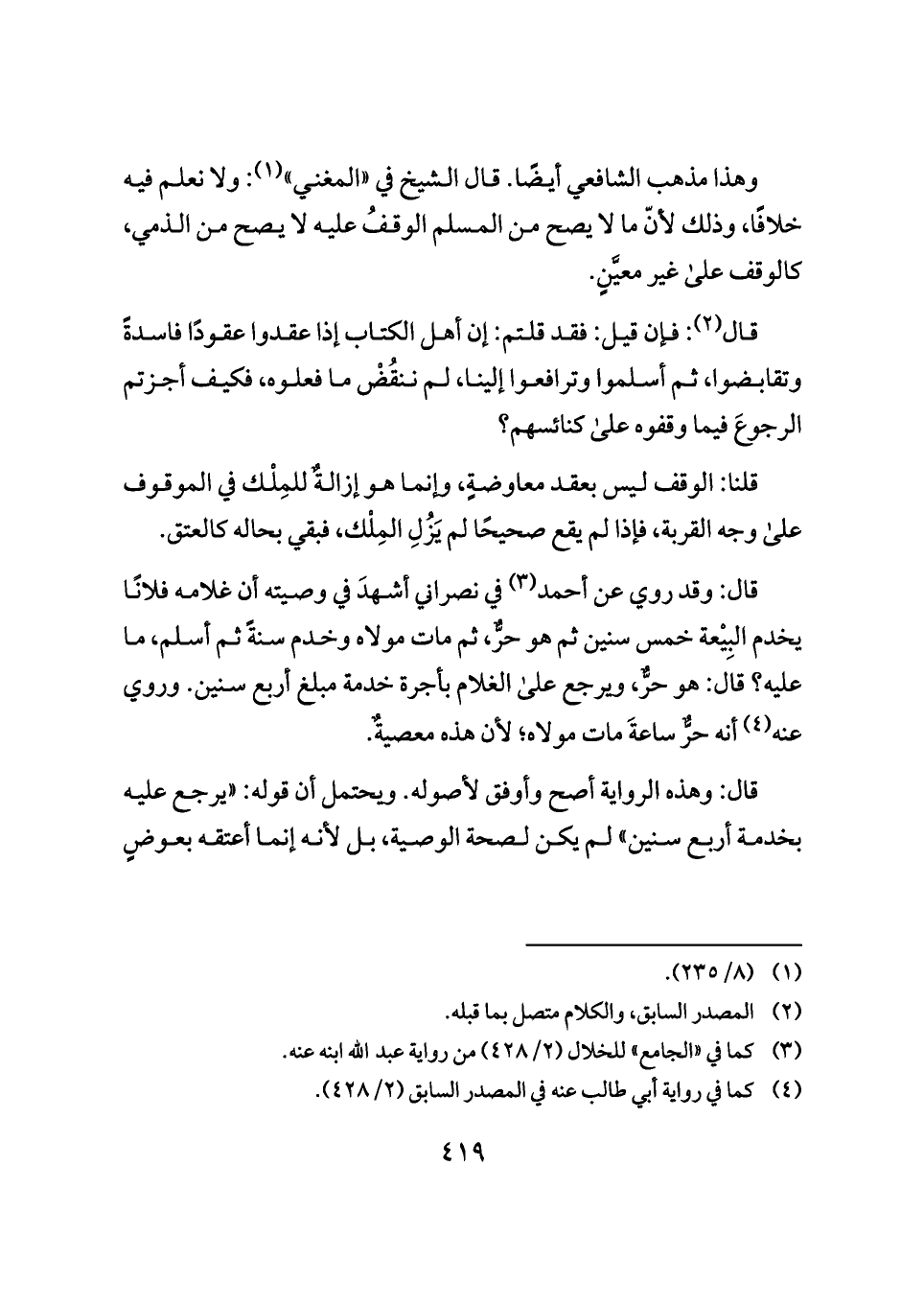 قال: وقد روي عن أحمد (¬٣) في نصراني أشهدَ في وصيته أن غلامه فلانًا يخدم البِيْعة خمس سنين ثم هو حرٌّ، ثم مات مولاه وخدم سنةً ثم أسلم، ما عليه؟ قال: هو حرٌّ، ويرجع على الغلام بأجرة خدمة مبلغ أربع سنين. وروي عنه (¬٤) أنه حرٌّ ساعةَ مات مولاه؛ لأن هذه معصيةٌ.