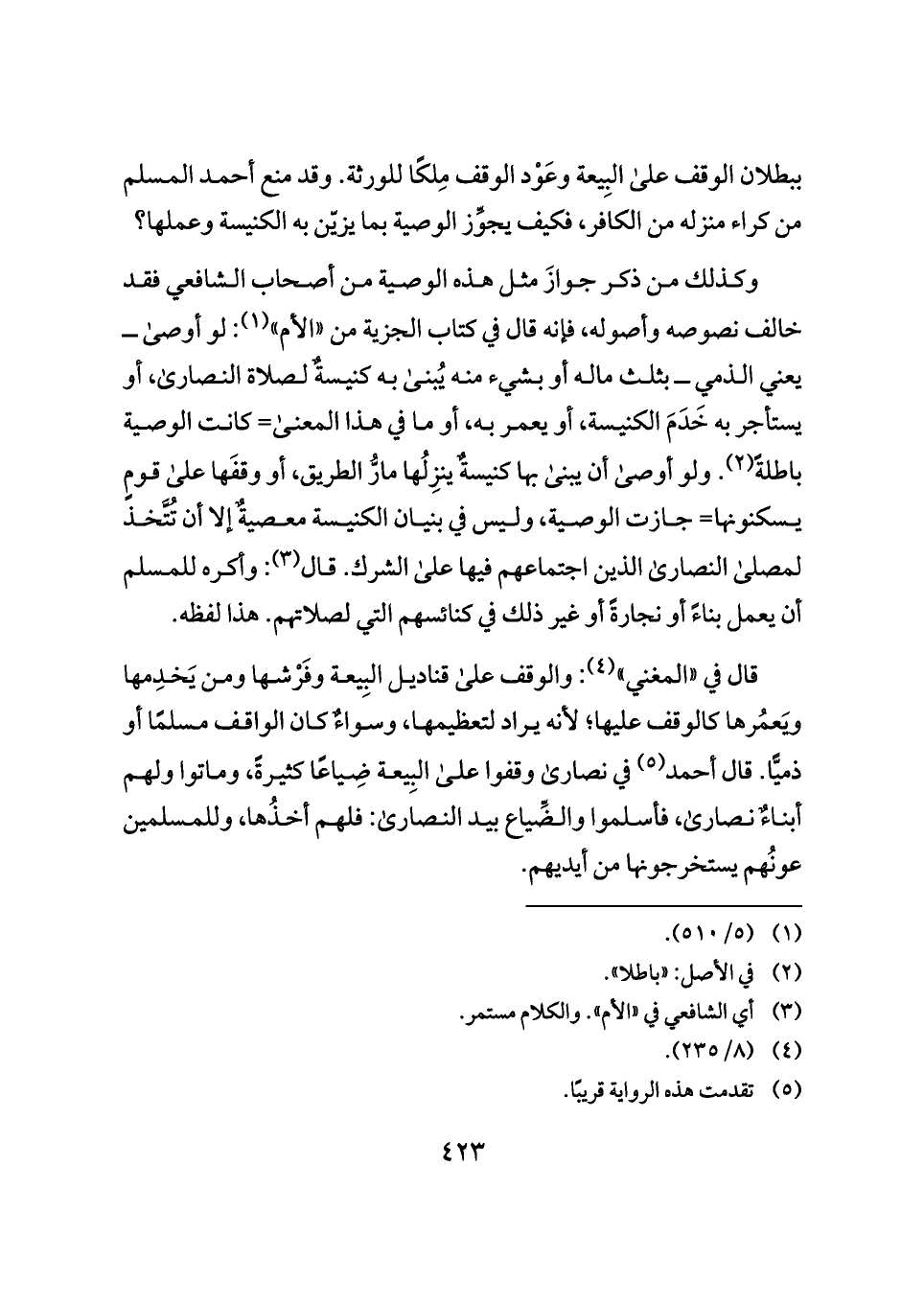 ببطلان الوقف على البِيعة وعَوْد الوقف مِلكًا للورثة. وقد منع أحمد المسلم من كراء منزله من الكافر، فكيف يجوِّز الوصية بما يزيّن به الكنيسة وعملها؟