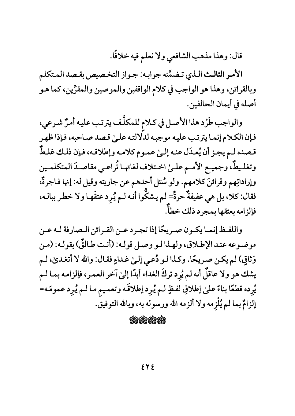 والواجب طَرْد هذا الأصل في كلامٍ للمكلَّف يترتب عليه أمرٌ شرعي، فإن الكلام إنما يترتب عليه موجبه لدلالته على قصد صاحبه، فإذا ظهر قصده لم يجز أن يُعدَل عنه إلى عموم كلامه وإطلاقه، فإن ذلك غلطٌ وتغليطٌ، وجميع الأمم على اختلاف لغاتها تُراعي مقاصدَ المتكلمين وإراداتِهم وقرائنَ كلامهم. ولو سُئل أحدهم عن جاريته وقيل له: إنها فاجرةٌ، فقال: كلا، بل هي عفيفةٌ حرةٌ= لم يشكُّوا أنه لم يُرِد عتقَها ولا خطر بباله، فإلزامه بعتقها بمجرد ذلك خطأٌ.