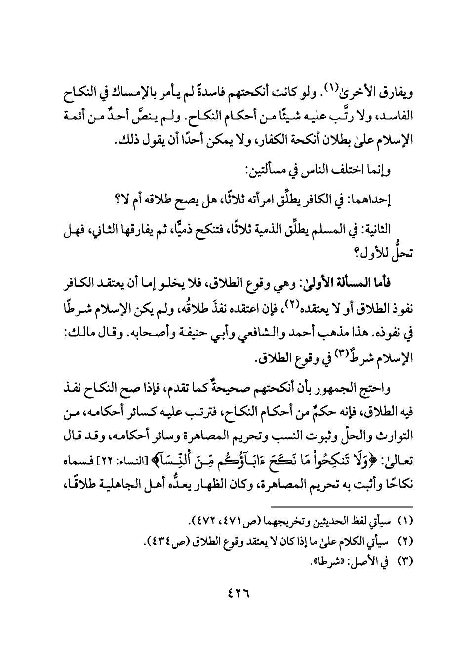فأما المسألة الأولى: وهي وقوع الطلاق، فلا يخلو إما أن يعتقد الكافر نفوذ الطلاق أو لا يعتقده (¬٢)، فإن اعتقده نفذَ طلاقُه، ولم يكن الإسلام شرطًا في نفوذه. هذا مذهب أحمد والشافعي وأبي حنيفة وأصحابه. وقال مالك: الإسلام شرطٌ (¬٣) في وقوع الطلاق.