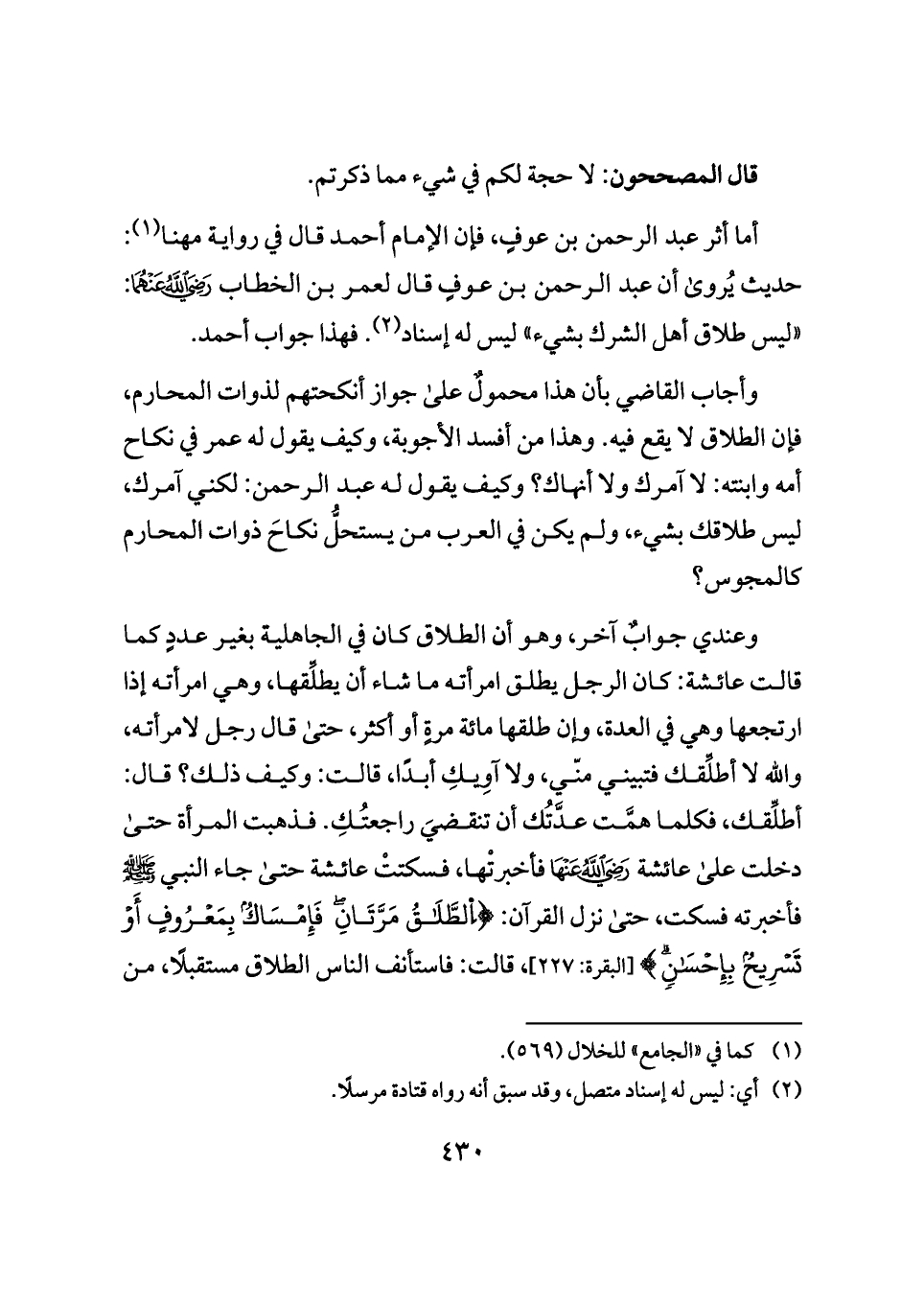 وأجاب القاضي بأن هذا محمولٌ على جواز أنكحتهم لذوات المحارم، فإن الطلاق لا يقع فيه. وهذا من أفسد الأجوبة، وكيف يقول له عمر في نكاح أمه وابنته: لا آمرك ولا أنهاك؟ وكيف يقول له عبد الرحمن: لكني آمرك، ليس طلاقك بشيء، ولم يكن في العرب من يستحلُّ نكاحَ ذوات المحارم كالمجوس؟