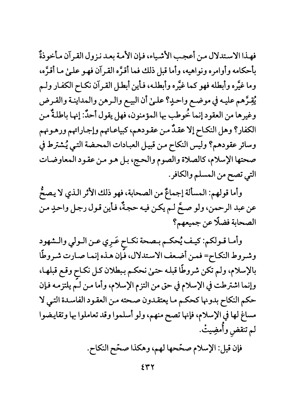 فهذا الاستدلال من أعجب الأشياء، فإن الأمة بعد نزول القرآن مأخوذةٌ بأحكامه وأوامره ونواهيه، وأما قبل ذلك فما أقرَّه القرآن فهو على ما أقرَّه، وما غيَّره وأبطله فهو كما غيَّره وأبطله، فأين أبطل القرآن نكاح الكفار ولم يُقِرَّهم عليه في موضع واحدٍ؟ على أن البيع والرهن والمداينة والقرض وغيرها من العقود إنما خُوطب بها المؤمنون، فهل يقول أحدٌ: إنها باطلةٌ من الكفار؟ وهل النكاح إلا عقدٌ من عقودهم، كبياعاتهم وإجاراتهم ورهونهم وسائر عقودهم؟ وليس النكاح من قبيل العبادات المحضة التي يُشترط في صحتها الإسلام، كالصلاة والصوم والحج، بل هو من عقود المعاوضات التي تصح من المسلم والكافر.