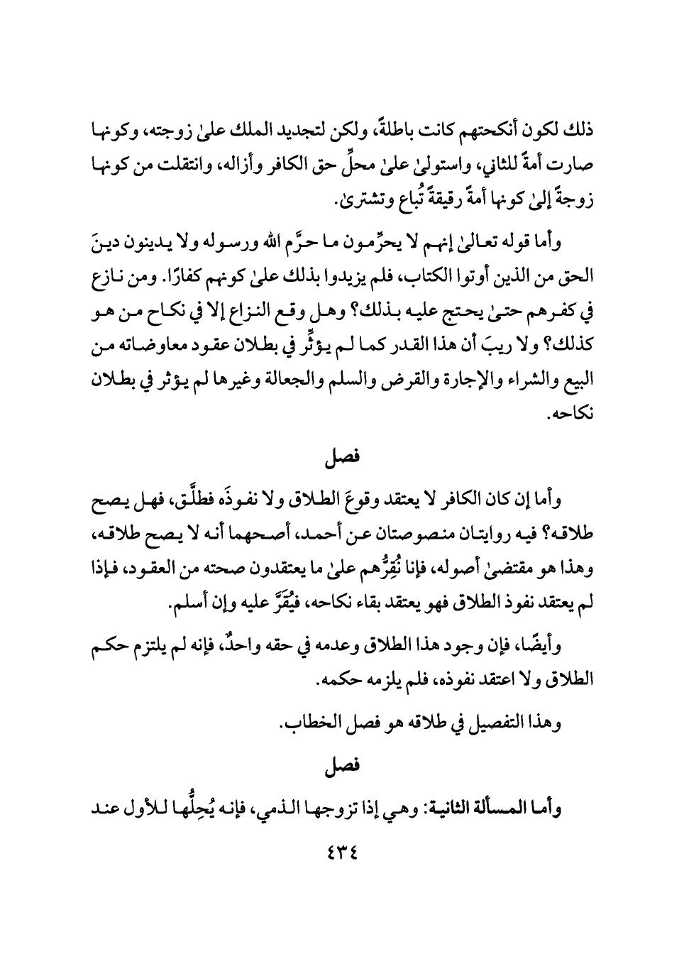 وأما قوله تعالى إنهم لا يحرِّمون ما حرَّم الله ورسوله ولا يدينون دينَ الحق من الذين أوتوا الكتاب، فلم يزيدوا بذلك على كونهم كفارًا. ومن نازع في كفرهم حتى يحتج عليه بذلك؟ وهل وقع النزاع إلا في نكاح من هو كذلك؟ ولا ريبَ أن هذا القدر كما لم يؤثِّر في بطلان عقود معاوضاته من البيع والشراء والإجارة والقرض والسلم والجعالة وغيرها لم يؤثر في بطلان نكاحه.