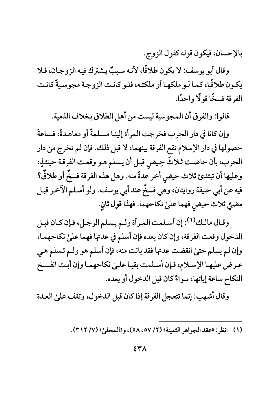 وإن كانا في دار الحرب فخرجت المرأة إلينا مسلمةً أو معاهدةً، فساعةَ حصولها في دار الإسلام تقع الفرقة بينهما، لا قبل ذلك. فإن لم تخرج من دار الحرب، بأن حاضت ثلاثَ حِيضٍ قبل أن يسلم هو وقعت الفرقة حينئذٍ، وعليها أن تبتدئ ثلاث حيضٍ أخر عدةً منه. وهل هذه الفرقة فسخٌ أو طلاقٌ؟ فيه عن أبي حنيفة روايتان، وهي فسخٌ عند أبي يوسف. ولو أسلم الآخر قبل مضيِّ ثلاث حيضٍ فهما على نكاحهما. فهذا قول ثانٍ.