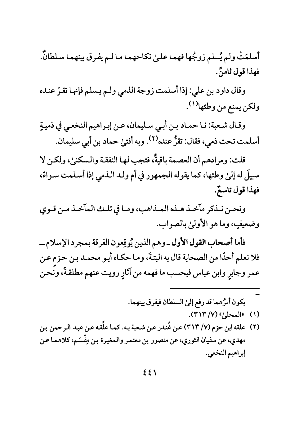 فأما أصحاب القول الأول ــ وهم الذين يُوقِعون الفرقة بمجرد الإسلام ــ فلا نعلم أحدًا من الصحابة قال به البتةَ، وما حكاه أبو محمد بن حزمٍ عن عمر وجابرٍ وابن عباس فبحسب ما فهمه من آثارٍ رويت عنهم مطلقةً، ونحن