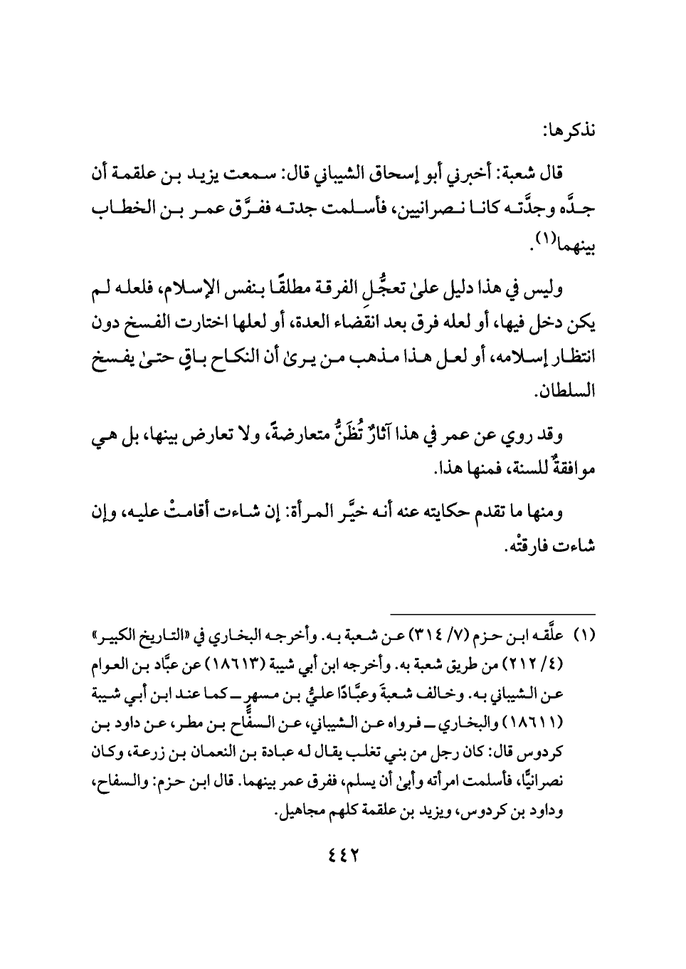 وليس في هذا دليل على تعجُّلِ الفرقة مطلقًا بنفس الإسلام، فلعله لم يكن دخل فيها، أو لعله فرق بعد انقضاء العدة، أو لعلها اختارت الفسخ دون انتظار إسلامه، أو لعل هذا مذهب من يرى أن النكاح باقٍ حتى يفسخ السلطان.