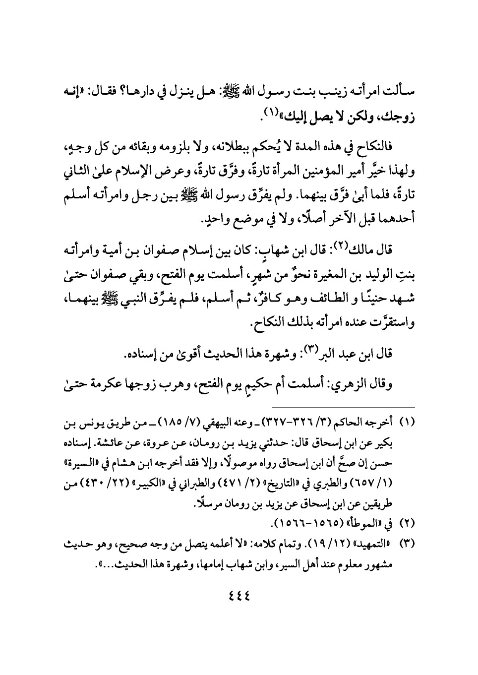 قال مالك (¬٢): قال ابن شهابٍ: كان بين إسلام صفوان بن أمية وامرأته بنتِ الوليد بن المغيرة نحوٌ من شهرٍ، أسلمت يوم الفتح، وبقي صفوان حتى شهد حنينًا و الطائف وهو كافرٌ، ثم أسلم، فلم يفرِّق النبي - صلى الله عليه وسلم - بينهما، واستقرَّت عنده امرأته بذلك النكاح.