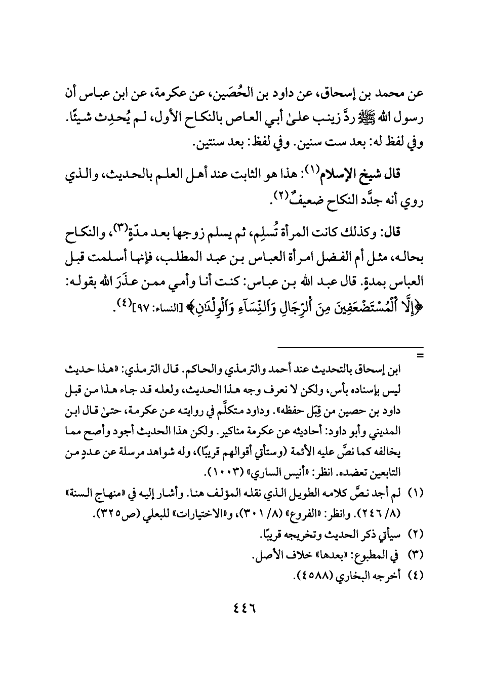 عن محمد بن إسحاق، عن داود بن الحُصَين، عن عكرمة، عن ابن عباس أن رسول الله - صلى الله عليه وسلم - ردَّ زينب على أبي العاص بالنكاح الأول، لم يُحدِث شيئًا. وفي لفظ له: بعد ست سنين. وفي لفظ: بعد سنتين.