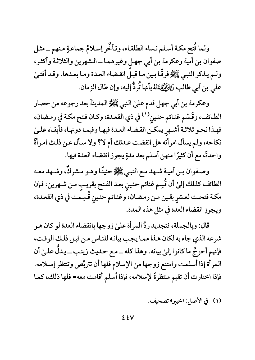 ولما فُتح مكة أسلم نساء الطلقاء، وتأخَّر إسلامُ جماعةٍ منهم ــ مثل صفوان بن أمية وعكرمة بن أبي جهلٍ وغيرهما ــ الشهرين والثلاثة وأكثر، ولم يذكر النبي - صلى الله عليه وسلم - فرقًا بين ما قبل انقضاء العدة وما بعدها. وقد أفتى علي بن أبي طالب - رضي الله عنه - بأنها تُردُّ إليه، وإن طال الزمان.