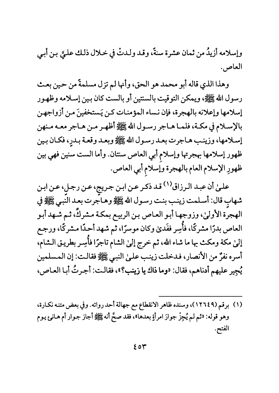 وهذا الذي قاله أبو محمد هو الحق، وأنها لم تزل مسلمةً من حين بعث رسول الله - صلى الله عليه وسلم -، ويمكن التوقيت بالسنتين أو بالست كان بين إسلامه وظهور إسلامها وإعلانه بالهجرة، فإن نساء المؤمنات كن يَستخفينَ من أزواجهن بالإسلام في مكة، فلما هاجر رسول الله - صلى الله عليه وسلم - أظهر من هاجر معه منهن إسلامها، وزينب هاجرت بعد رسول الله - صلى الله عليه وسلم - وبعد وقعة بدرٍ، فكان بين ظهور إسلامها بهجرتها وإسلامِ أبي العاص سنتان. وأما الست سنين فهي بين ظهورِ الإسلام العام بالهجرة وإسلامِ أبي العاص.