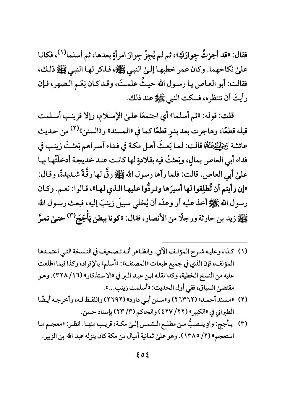 قلت: قوله: "ثم أسلما" أي اجتمعَا على الإسلام، وإلا فزينب أسلمت قبله قطعًا، وهاجرت بعد بدرٍ قطعًا كما في "المسند" و"السنن" (¬٢) من حديث عائشة - رضي الله عنهما - قالت: لما بَعثَ أهل مكة في فداء أسراهم بَعثتْ زينب في فداء أبي العاص بمالٍ، وبَعثتْ فيه بقلادةٍ لها كانت عند خديجة أدخلَتْها بها على أبي العاص. قالت: فلما رآها رسول الله - صلى الله عليه وسلم - رقَّ لها رقَّةً شديدةً، وقال: "إن رأيتم أن تُطلِقوا لها أسيرَها وتردُّوا عليها الذي لها"، قالوا: نعم. وكان رسول الله - صلى الله عليه وسلم - أخذ عليه أو وعدَه أن يُخلي سبيلَ زينبَ إليه، فبعث رسول الله - صلى الله عليه وسلم - زيد بن حارثة ورجلًا من الأنصار، فقال: "كونا ببطن يَأْجَجَ (¬٣) حتى تمرَّ