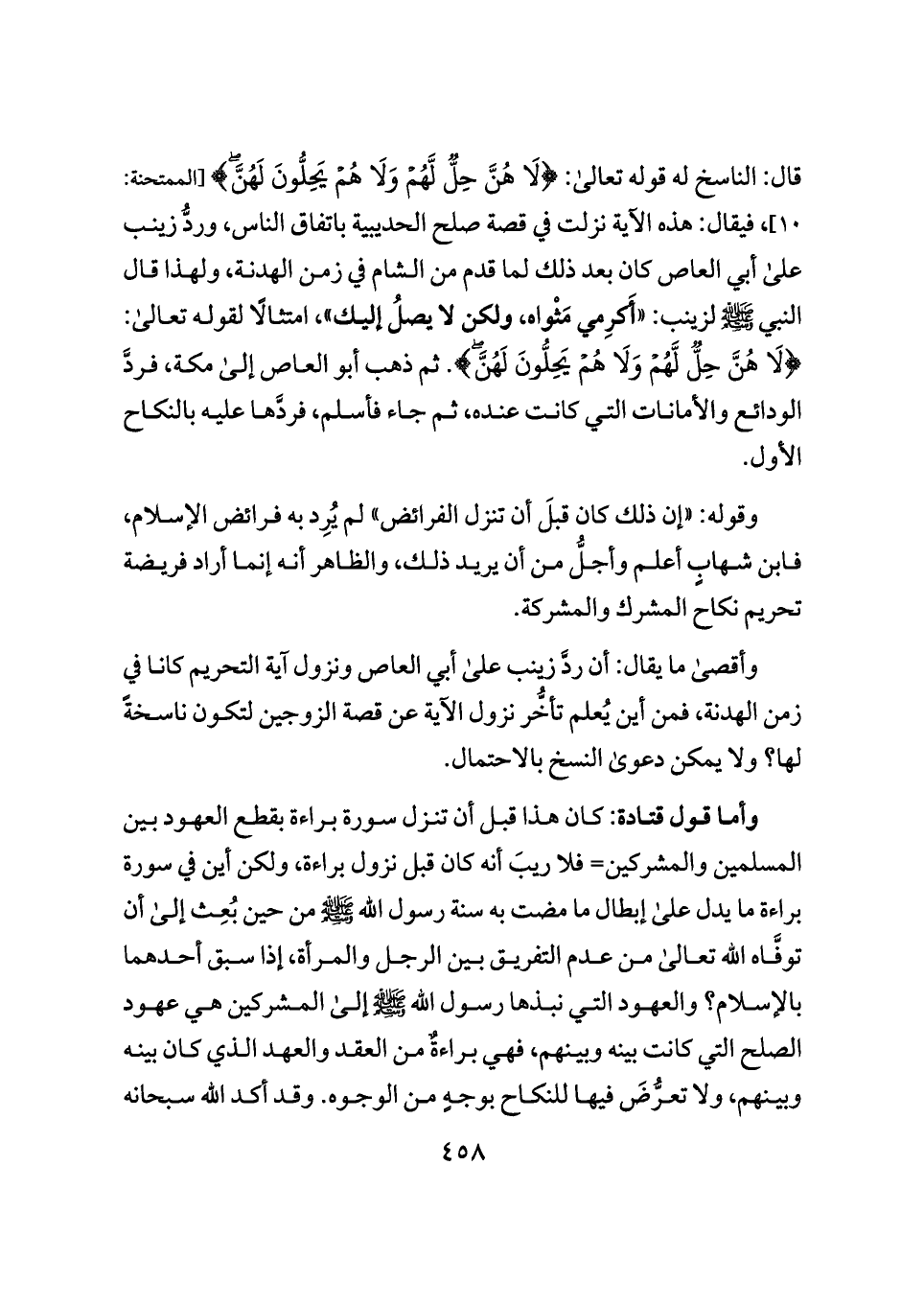 قال: الناسخ له قوله تعالى: {لَا هُنَّ حِلٌّ لَّهُمْ وَلَا هُمْ يَحِلُّونَ لَهُنَّ} [الممتحنة: ١٠]، فيقال: هذه الآية نزلت في قصة صلح الحديبية باتفاق الناس، وردُّ زينب على أبي العاص كان بعد ذلك لما قدم من الشام في زمن الهدنة، ولهذا قال النبي - صلى الله عليه وسلم - لزينب: "أَكرِمي مَثْواه، ولكن لا يصلُ إليك"، امتثالًا لقوله تعالى: {لَا هُنَّ حِلٌّ لَّهُمْ وَلَا هُمْ يَحِلُّونَ لَهُنَّ}. ثم ذهب أبو العاص إلى مكة، فردَّ الودائع والأمانات التي كانت عنده، ثم جاء فأسلم، فردَّها عليه بالنكاح الأول.