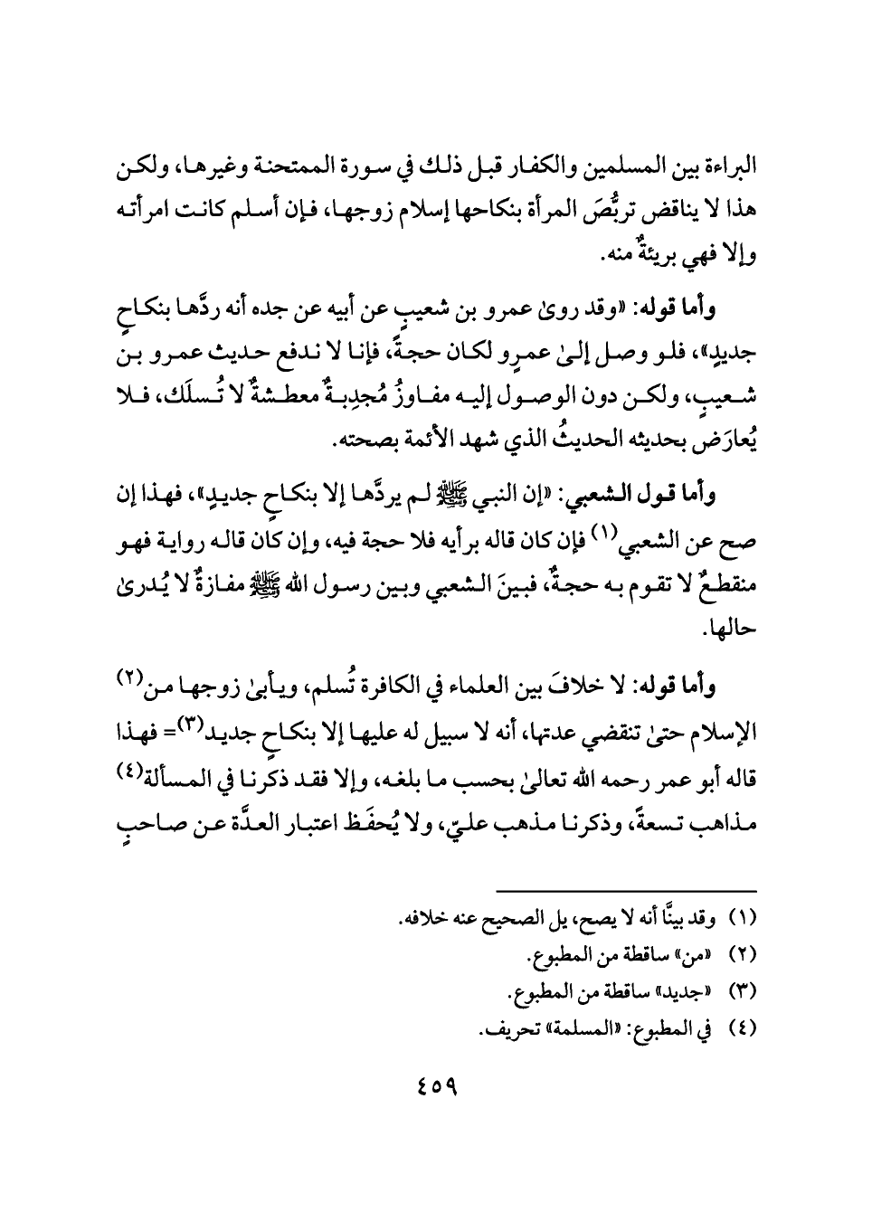 وأما قوله: "وقد روى عمرو بن شعيبٍ عن أبيه عن جده أنه ردَّها بنكاحٍ جديدٍ"، فلو وصل إلى عمرٍو لكان حجةً، فإنا لا ندفع حديث عمرو بن شعيبٍ، ولكن دون الوصول إليه مفاوزُ مُجدِبةٌ معطشةٌ لا تُسلَك، فلا يُعارَض بحديثه الحديثُ الذي شهد الأئمة بصحته.