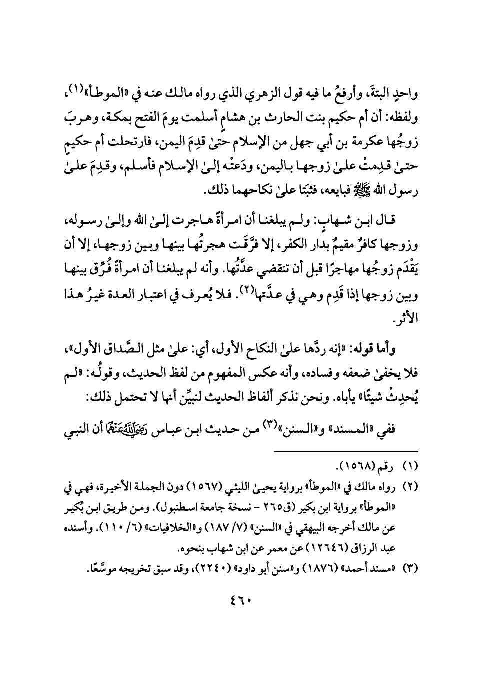 واحدٍ البتةَ، وأرفعُ ما فيه قول الزهري الذي رواه مالك عنه في "الموطأ" (¬١)، ولفظه: أن أم حكيم بنت الحارث بن هشامٍ أسلمت يومَ الفتح بمكة، وهربَ زوجُها عكرمة بن أبي جهل من الإسلام حتى قدِمَ اليمن، فارتحلت أم حكيمٍ حتى قدِمتْ على زوجها باليمن، ودَعتْه إلى الإسلام فأسلم، وقدِمَ على رسول الله - صلى الله عليه وسلم - فبايعه، فثبَتا على نكاحهما ذلك.