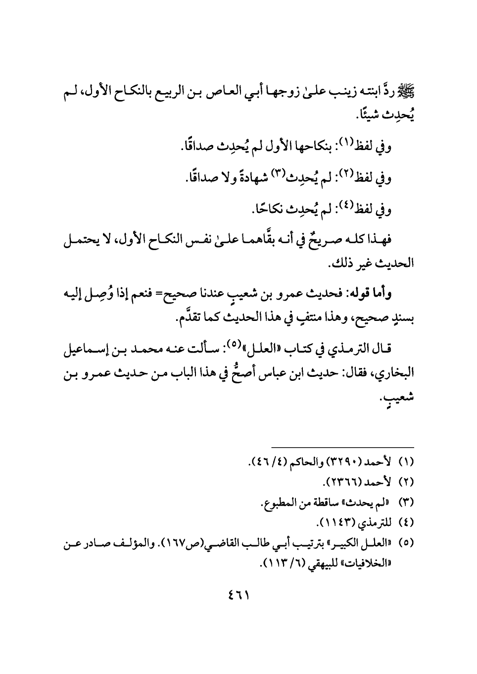 وأما قوله: فحديث عمرو بن شعيبٍ عندنا صحيح= فنعم إذا وُصِل إليه بسندٍ صحيح، وهذا منتفٍ في هذا الحديث كما تقدَّم.