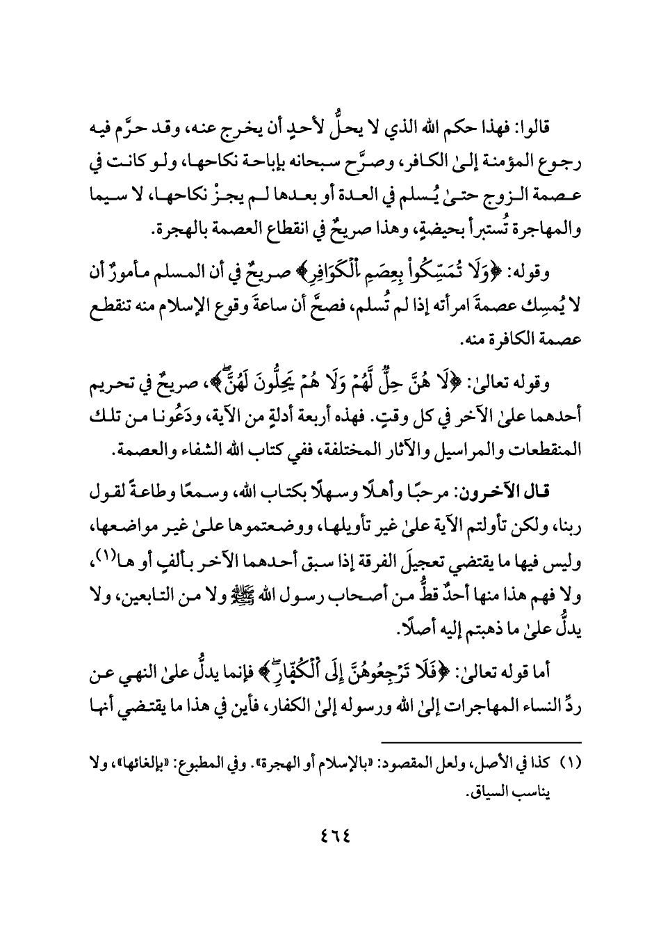 قالوا: فهذا حكم الله الذي لا يحلُّ لأحدٍ أن يخرج عنه، وقد حرَّم فيه رجوع المؤمنة إلى الكافر، وصرَّح سبحانه بإباحة نكاحها، ولو كانت في عصمة الزوج حتى يُسلم في العدة أو بعدها لم يجزْ نكاحها، لا سيما والمهاجرة تُستبرأ بحيضةٍ، وهذا صريحٌ في انقطاع العصمة بالهجرة.