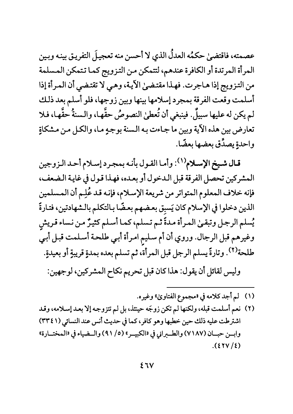 عصمته، فاقتضى حكمُه العدلُ الذي لا أحسن منه تعجيلَ التفريق بينه وبين المرأة المرتدة أو الكافرة عندهم، لتتمكن من التزويج كما تتمكن المسلمة من التزويج إذا هاجرت. فهذا مقتضى الآية، وهي لا تقتضي أن المرأة إذا أسلمت وقعت الفرقة بمجرد إسلامها بينها وبين زوجها، فلو أسلم بعد ذلك لم يكن له عليها سبيلٌ. فينبغي أن تُعطى النصوصُ حقَّها، والسنةُ حقَّها، فلا تعارض بين هذه الآية وبين ما جاءت به السنة بوجهٍ ما، والكل من مشكاةٍ واحدةٍ يصدِّق بعضها بعضًا.