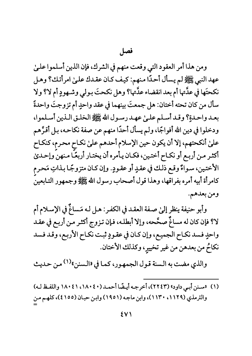 ومن هذا أمر العقود التي وقعت منهم في الشرك، فإن الذين أسلموا على عهد النبي - صلى الله عليه وسلم - لم يسأل أحدًا منهم: كيف كان عقدك على امرأتك؟ وهل نكحتَها في عدَّتها أم بعد انقضاء عدَّتها؟ وهل نكحتَ بولي وشهودٍ أم لا؟ ولا سأل من كان تحته أختان: هل جمعتَ بينهما في عقد واحدٍ أم تزوجتَ واحدةً بعد واحدةٍ؟ وقد أسلم على عهد رسول الله - صلى الله عليه وسلم - الخلق الذين أسلموا، ودخلوا في دين الله أفواجًا، ولم يسأل أحدًا منهم عن صفة نكاحه، بل أقرَّهم على أنكحتهم، إلا أن يكون حين الإسلام أحدهم على نكاحٍ محرمٍ، كنكاح أكثر من أربع أو نكاح أختين، فكان يأمره أن يختار أربعًا منهن وإحدى الأختين، سواءٌ وقع ذلك في عقدٍ أو عقودٍ. وإن كان متزوجًا بذاتِ مَحرمٍ كامرأة أبيه أمره بفراقها، وهذا قول أصحاب رسول الله - صلى الله عليه وسلم - وجمهور التابعين ومن بعدهم.