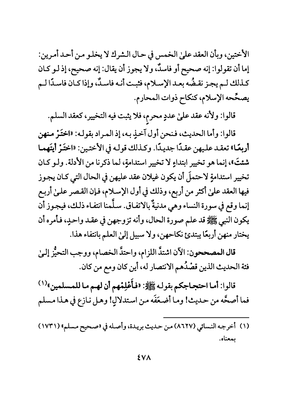 قالوا: وأما الحديث، فنحن أول آخذٍ به، إذ المراد بقوله: "اختَرْ منهن أربعًا" تعقد عليهن عقدًا جديدًا. وكذلك قوله في الأختين: "اختَرْ أيتَهما شئتَ"، إنما هو تخيير ابتداءٍ لا تخيير استدامةٍ، لما ذكرنا من الأدلة. ولو كان تخيير استدامةٍ لاحتملَ أن يكون غيلان عقد عليهن في الحال التي كان يجوز فيها العقد على أكثر من أربع، وذلك في أول الإسلام، فإن القصر على أربع إنما وقع في سورة النساء وهي مدنيةٌ بالاتفاق. سلَّمنا انتفاء ذلك، فيجوز أن يكون النبي - صلى الله عليه وسلم - قد علم صورة الحال، وأنه تزوجهن في عقد واحدٍ، فأمره أن يختار منهن أربعًا يبتدئ نكاحهن، ولا سبيل إلى العلم بانتفاء هذا.