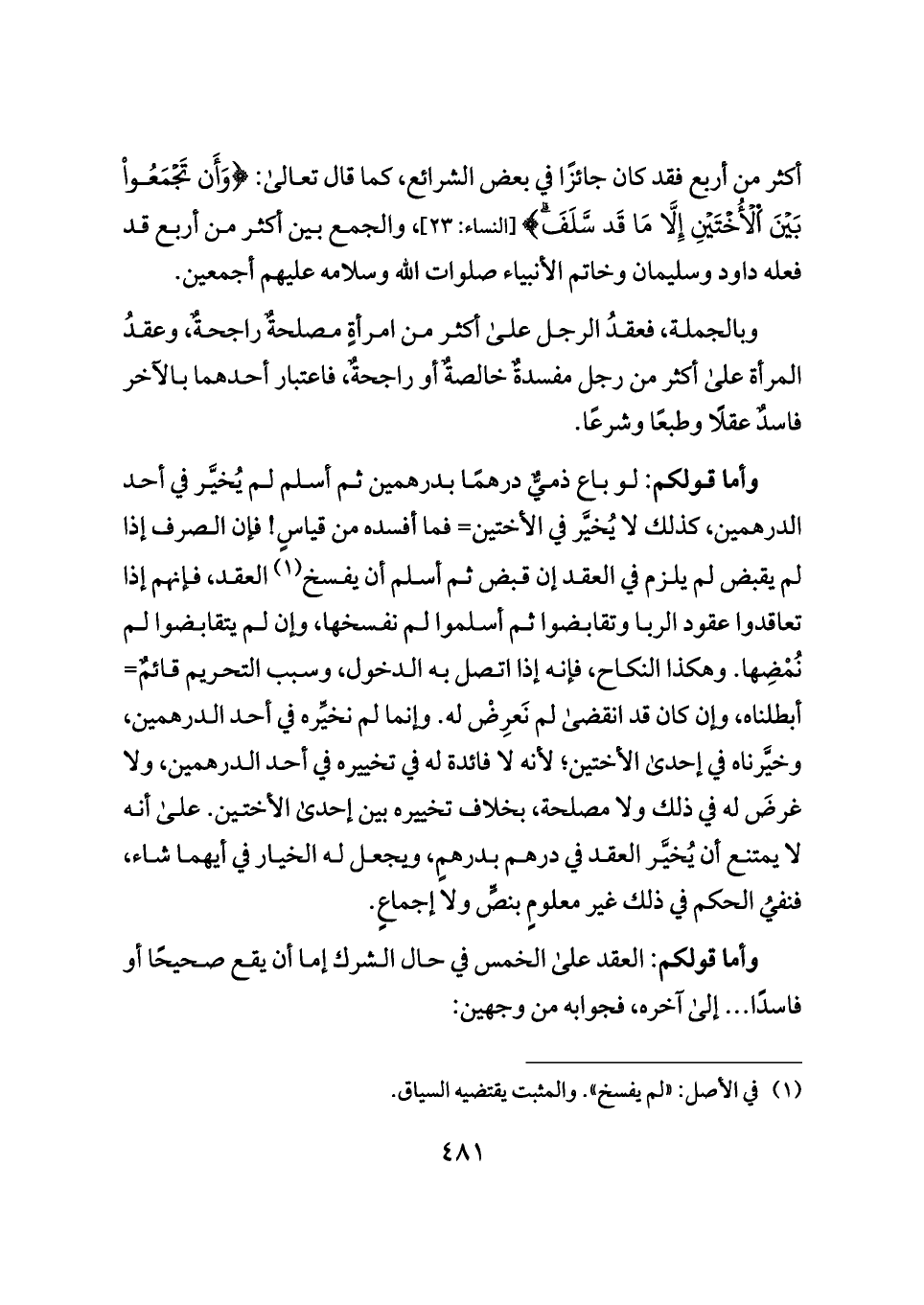 وأما قولكم: لو باع ذميٌّ درهمًا بدرهمين ثم أسلم لم يُخيَّر في أحد الدرهمين، كذلك لا يُخيَّر في الأختين= فما أفسده من قياسٍ! فإن الصرف إذا لم يقبض لم يلزم في العقد إن قبض ثم أسلم أن يفسخ (¬١) العقد، فإنهم إذا تعاقدوا عقود الربا وتقابضوا ثم أسلموا لم نفسخها، وإن لم يتقابضوا لم نُمْضِها. وهكذا النكاح، فإنه إذا اتصل به الدخول، وسبب التحريم قائمٌ= أبطلناه، وإن كان قد انقضى لم نَعرِضْ له. وإنما لم نخيِّره في أحد الدرهمين، وخيَّرناه في إحدى الأختين؛ لأنه لا فائدة له في تخييره في أحد الدرهمين، ولا غرضَ له في ذلك ولا مصلحة، بخلاف تخييره بين إحدى الأختين. على أنه لا يمتنع أن يُخيَّر العقد في درهم بدرهمٍ، ويجعل له الخيار في أيهما شاء، فنفيُ الحكم في ذلك غير معلومٍ بنصٍّ ولا إجماعٍ.